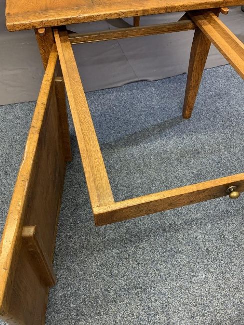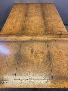 REPRODUCTION BURR OAK EXTENDING DINING TABLE peg-joined construction three plank top with cleated ends over a single dummy drawer with twist-out additional leaf and opposing blind drawer, both with brass knobs on tapering supports, excellent colour and condition, 73cms H, 100cms W, 137cms L closed, 199cms fully extended