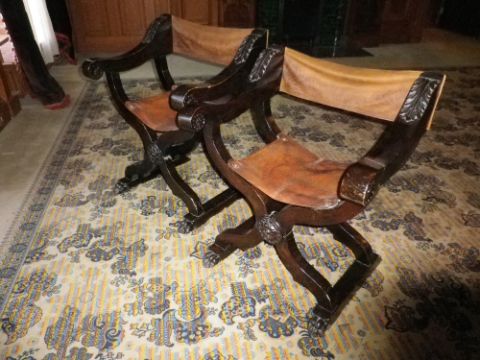 CONTINENTAL CARVED & STAINED WALNUT X FRAME CAMPAIGN TYPE FOLDING CHAIRS with leather seats and backs, rounded arm ends and front paw feet, 86cms H, 70cms W, 37cms seat depth