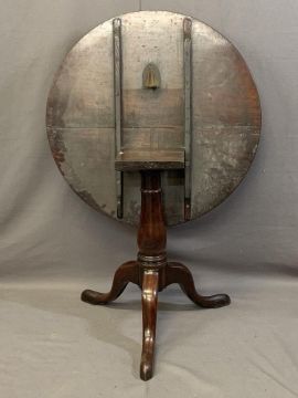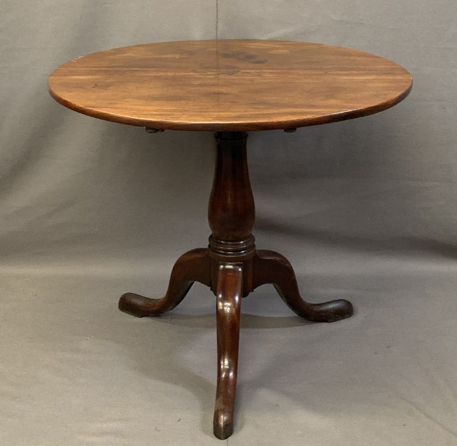 19TH CENTURY MAHOGANY TILT-TOP TRIPOD TABLE, 82.5cms diameter top on a bulbous turned column and three substantial feet, 72cms H