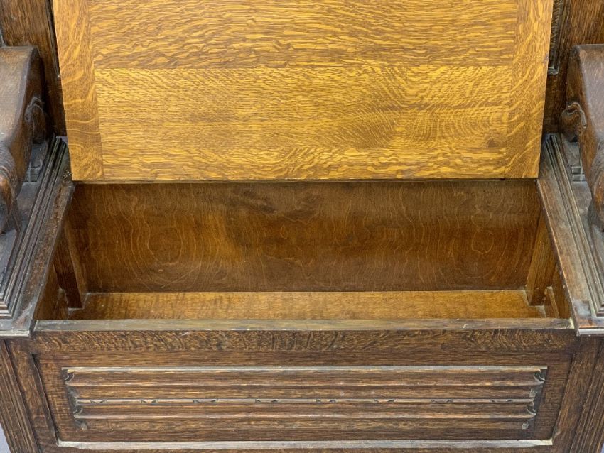 CARVED OAK MONK'S BENCH with crouching lion arms and linenfold front detail on bun feet, 99cms H fully open, 69cms H top down, 106cms W, 50.5cms D