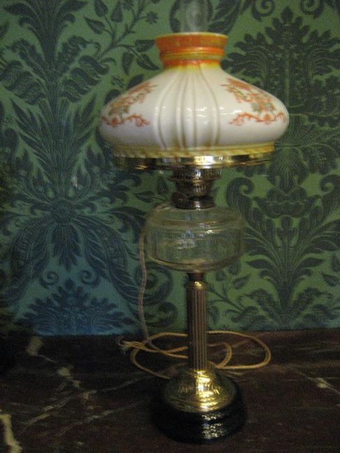 A CIRCULAR BASED BRASS CORINTHIAN COLUMN electrified oil lamp with clear reservoir and floral Milk glass shade