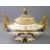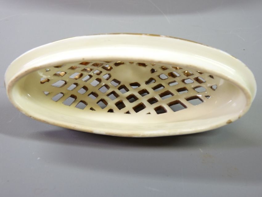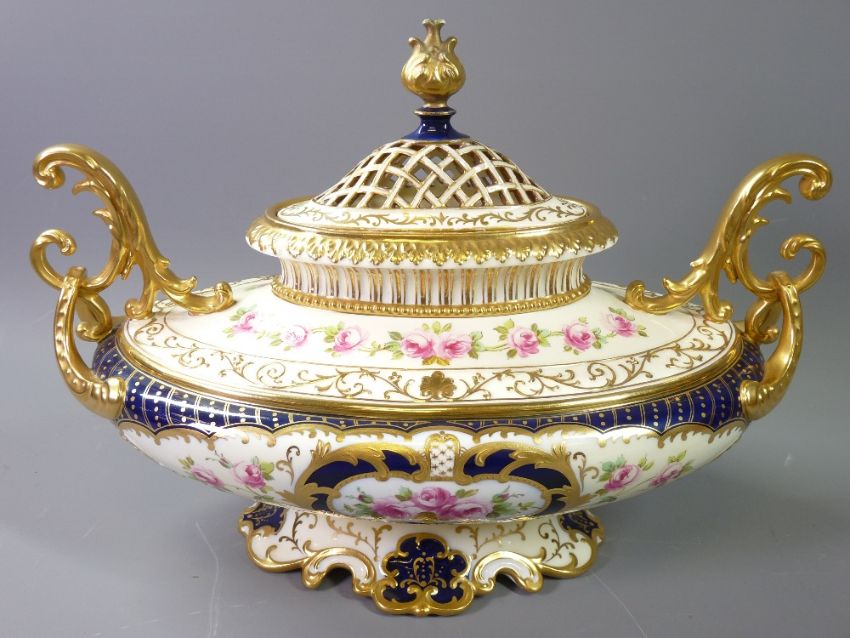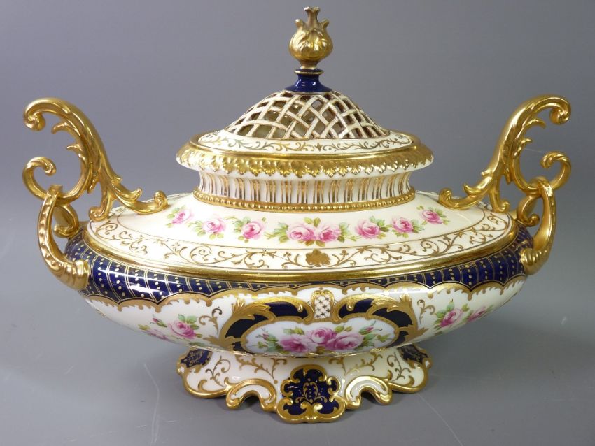 FINE WEDGWOOD OVAL BOAT SHAPED TWIN-HANDLED ROSE PATTERNED POT POURRI VASE with gilt and Crimson banding and exotic scrolled handles and having a latticed knopped lid, 31cms long