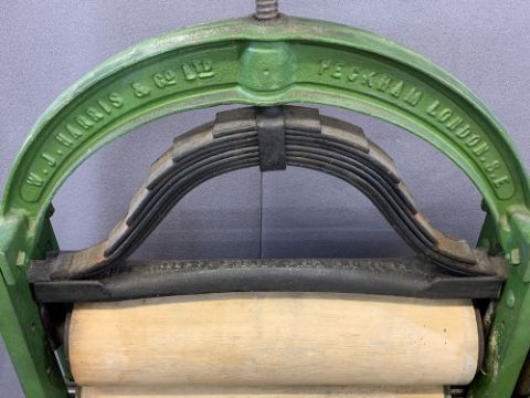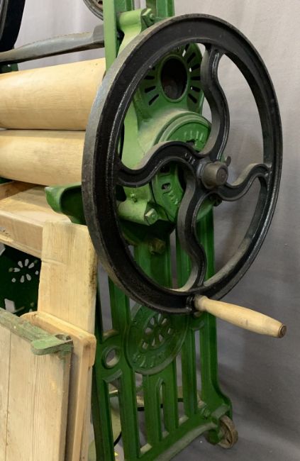 GOOD VINTAGE PAINTED CAST IRON MANGLE, W J Harris & Co Ltd, marked 'The Harris Climax', apparently in all original condition, worm evidence to the rollers, 151cms H, 100cms across including winding handle, 46cms D