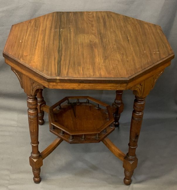 GOOD EDWARDIAN WALNUT OCTAGONAL TOP TABLE with galleried under-tier shelf on turned and block supports, 71.5cms H, 75 x 75cms top
