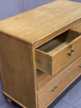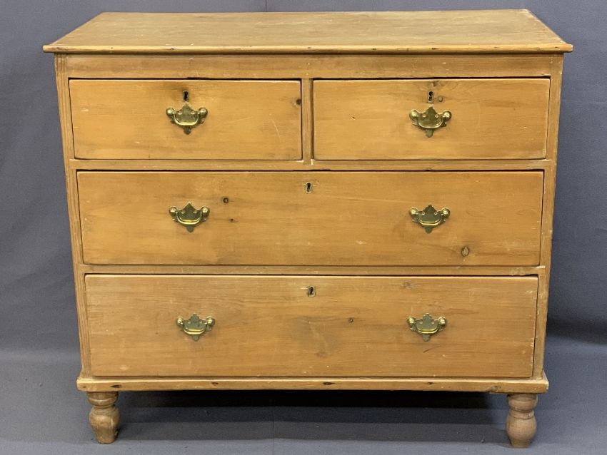 VINTAGE STRIPPED PINE CHEST of two short over two long drawers having fancy brass backplates and swing handles on bun feet, 82cms H, 94.5cms W, 46cms D