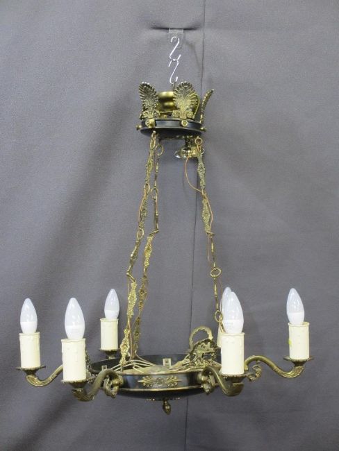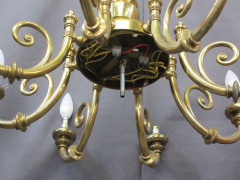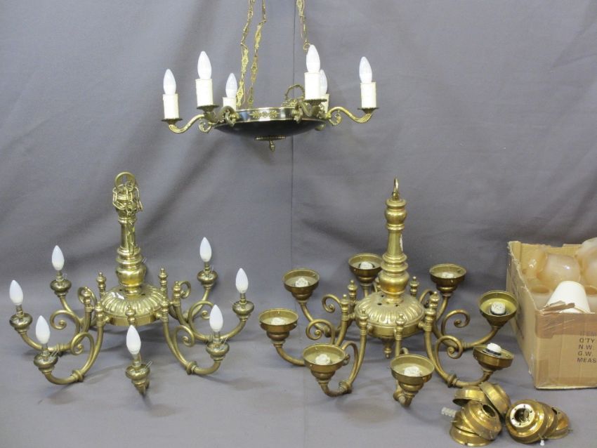 VINTAGE FRENCH STYLE CEILING CHANDELIERS (3) including a cast brass pair of eight branch with scroll detail, 58cms H, 73cms approx diameter