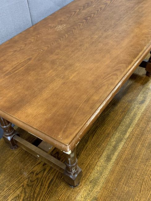 GOOD REPRODUCTION OAK LARGE COFFEE TABLE and one other, 52.5cms H, 153cms L, 75.5cms W and 42cms H, 99cms L, 49cms W measurements respectively