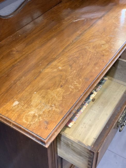 CIRCA 1900 TWO PIECE BEDROOM SUITE comprising triple mirrored and cabinet top dressing chest of two short over two long drawers, 175cms overall H, 107cms W, 48cms D and a mirrored and marble topped washstand with three drawers, the whole in mahogany with walnut fronted drawers, fancy copperised backplates and swing handles, 162cms overall H, 108cms W, 46cms D