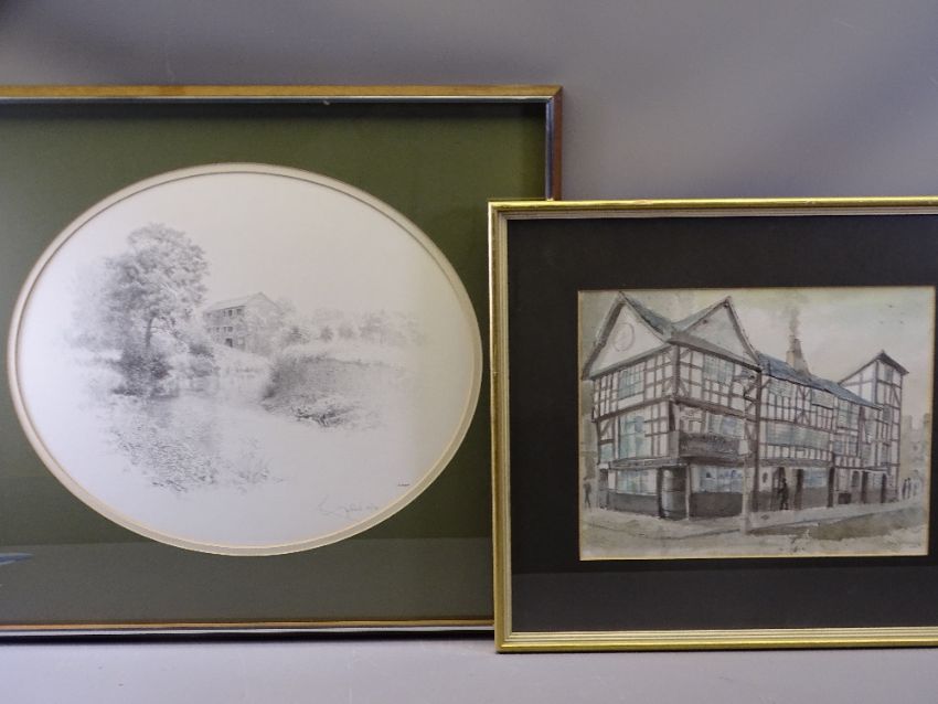 GELDART limited edition print - 'Brund Mill' in oval format, signed in pencil, label verso, 37 x 45cms and INDISTINCTIVELY SIGNED watercolour - 'The Shambles Manchester', 27 x 35cms