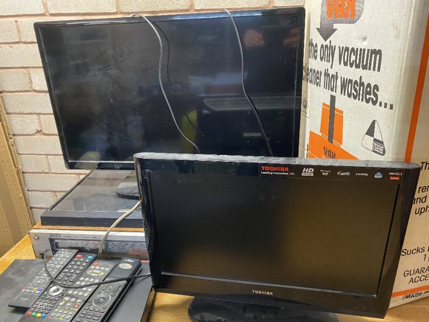 HOUSEHOLD ELECTRICS including Sony vintage stereo music system HMK-11, Logic flatscreen tv with remote control, Humax player, Vax and a Toshiba TV E/T
