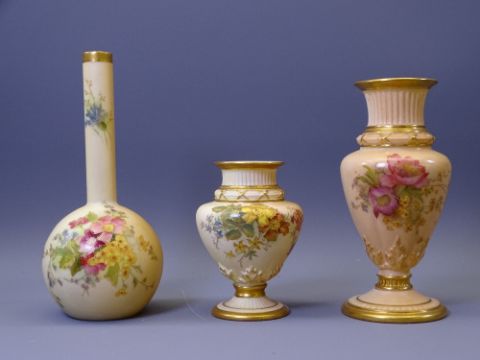 ROYAL WORCESTER BLUSH FLORAL CHINA - three pieces, a narrow necked onion shaped vase No 1215, 17cms H, a small pedestal vase Reg No 227600, pattern No 1727, 10cms H and a pedestal vase Reg No 230700, pattern No 1730, 15cms H