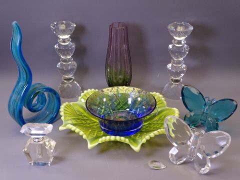 SWAROVSKI STYLE CANDLEHOLDERS, a pair, 21cms H, Vaseline glass dish, commemorative glass bowl and other Art glassware