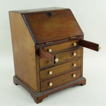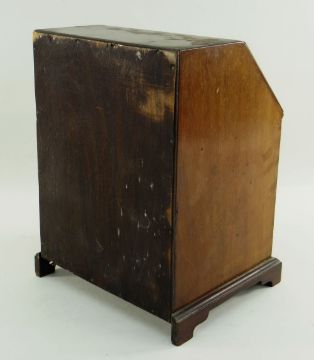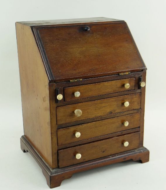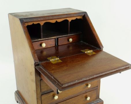 19TH CENTURY MINIATURE MAHOGANY BUREAU, angled fall with fitted interior, bracket feet, 21.5 x 18 x 27.5cm
