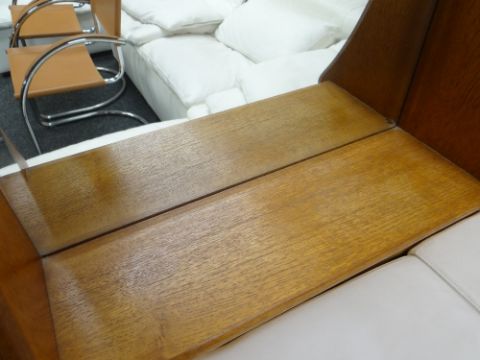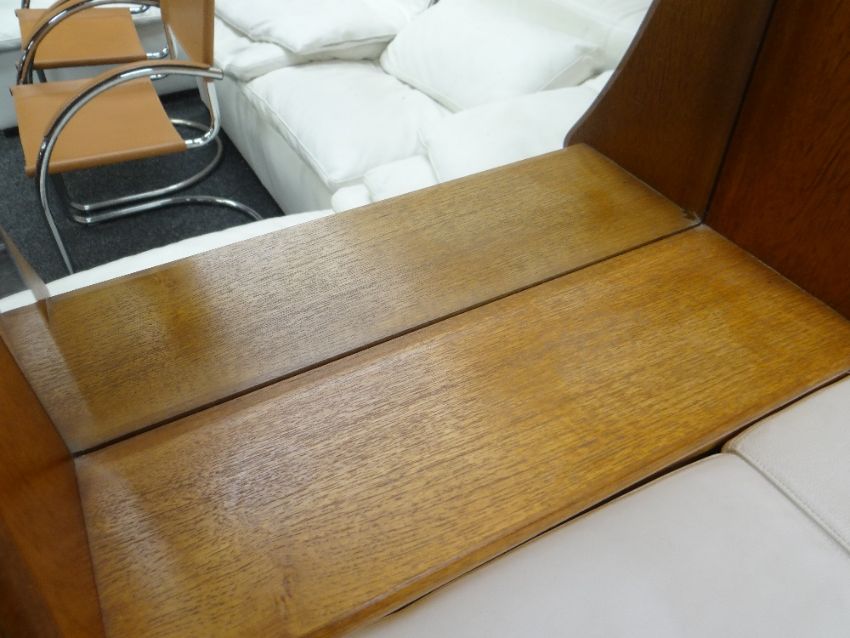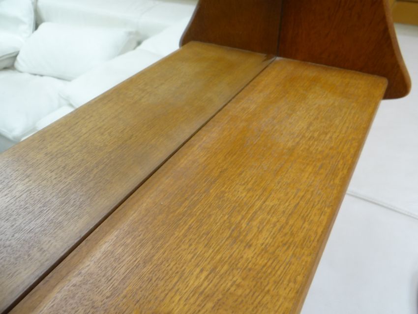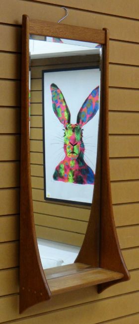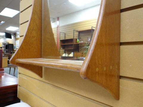 PEDERSON & HANSEN: MID-CENTURY DANISH TEAK WALL MIRROR, 114 x 44 x 17cmsLarge water stain on shelf. No other damage or marks.