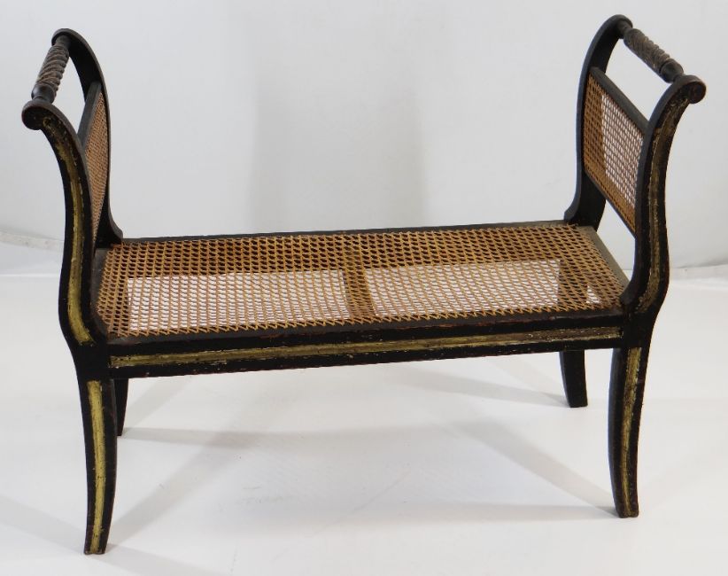 REGENCY-STYLE EBONISED WINDOW SEAT, caned scrolled sides and seat, later cushion, 82cms wide