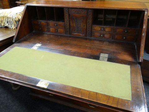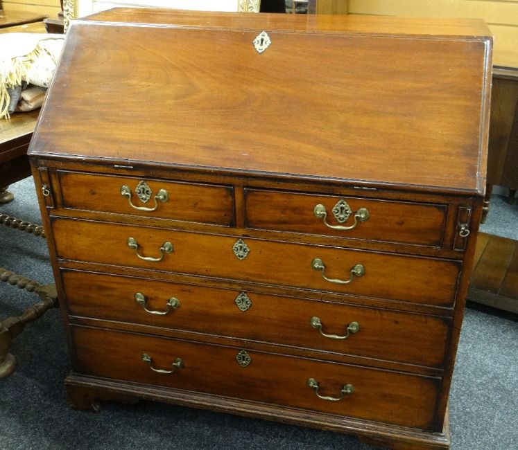 GEORGE III MAHOGANY BUREAU, angled fall enclosing fitted interior with later carved drawers and cupboard, above five drawers, bracket feet, 101 x 53.5 x 104cms