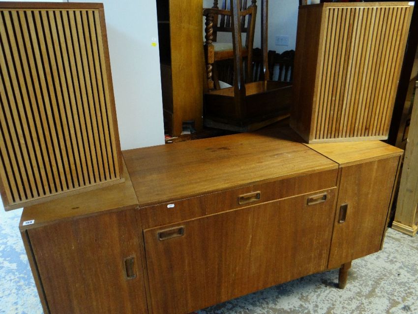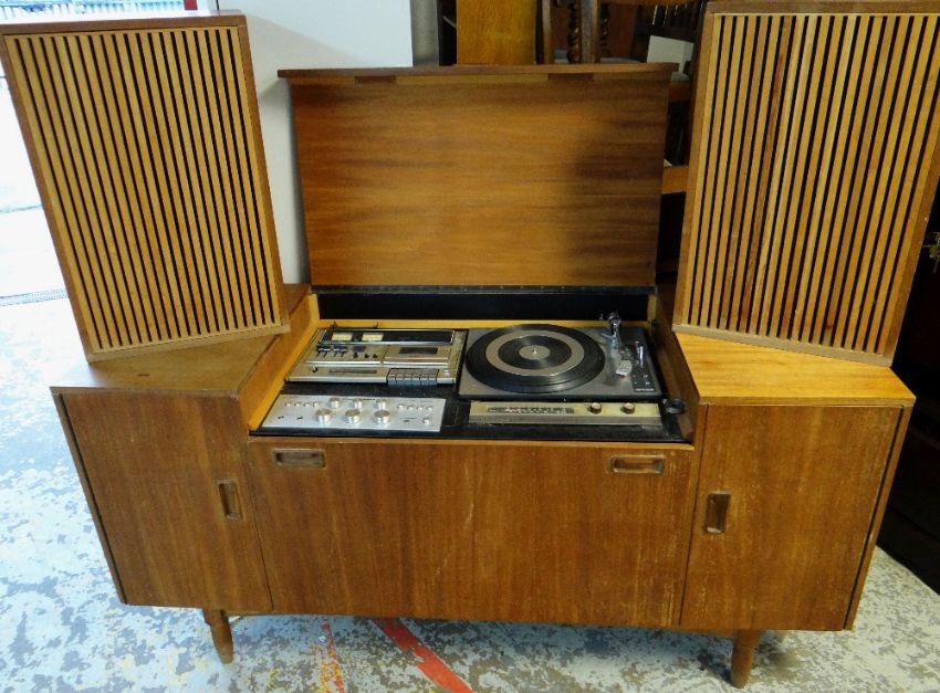 BESPOKE TEAK HI-FI CABINET fitted with Marantz amp, JVC cassette deck, Lenco turntable ETC and pair of encased speakers, believed Wharfedale (3)I have plugged it in.The lights on the tape deck work and the tape player plays, unfortunately I do not have any tapes or vinyl to test.The small blue light on the amp turns on and the turn table moves.Not sure what the speakers sound like, nothing to play.