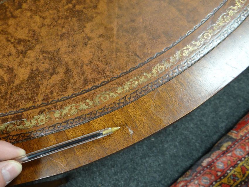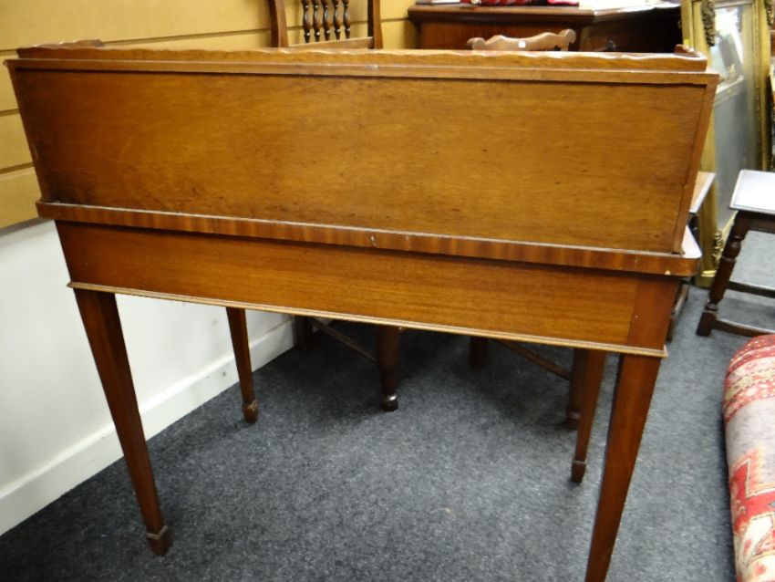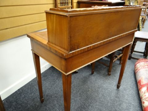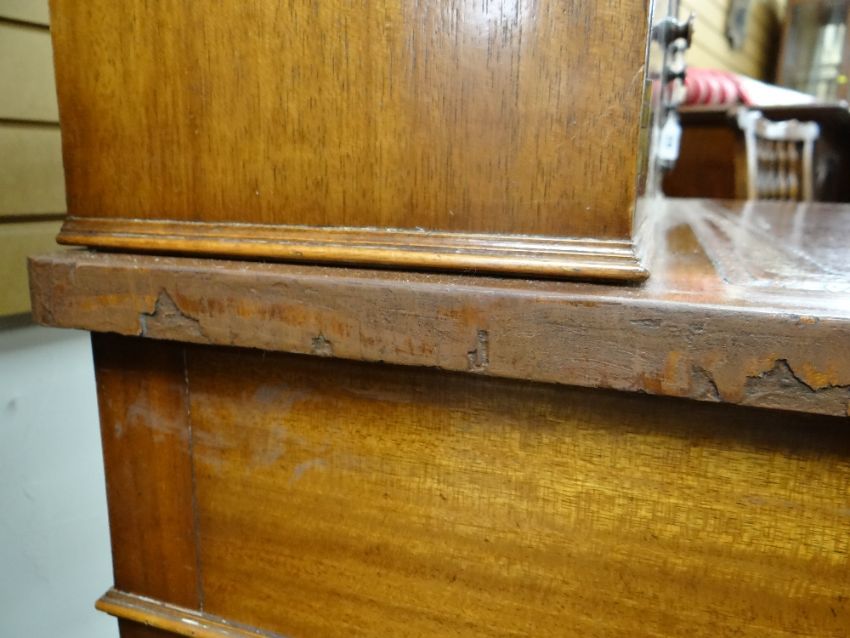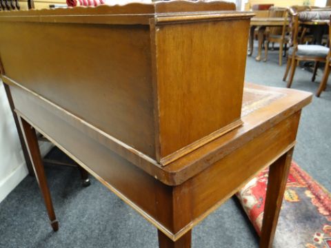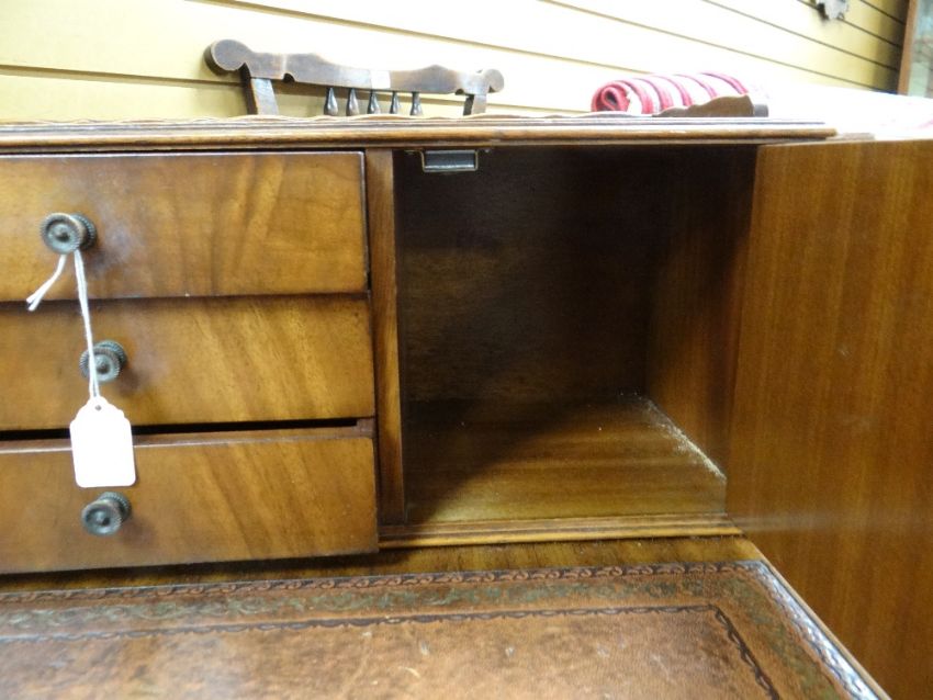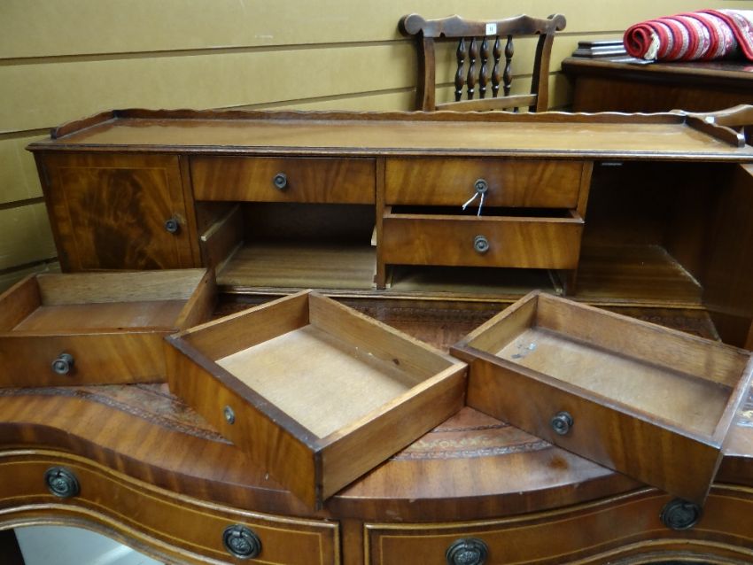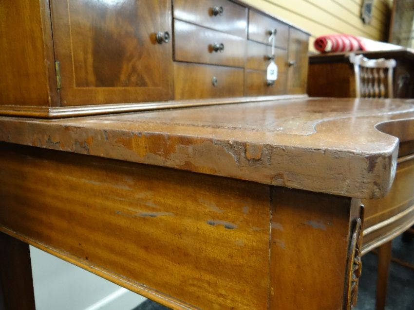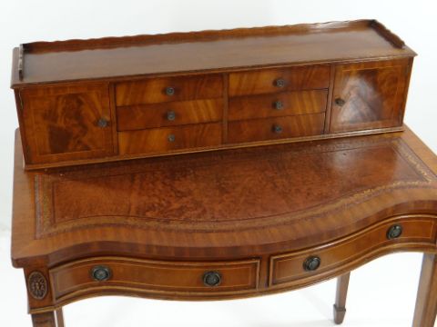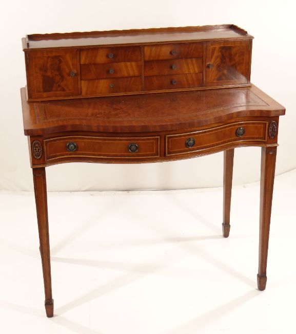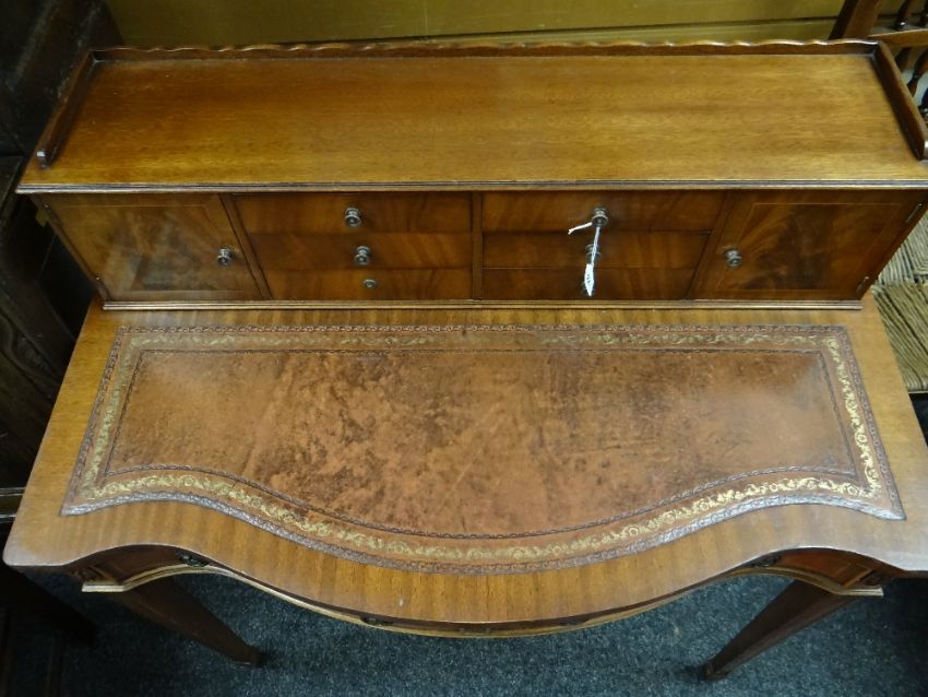 REPRODUCTION GEORGIAN-STYLE MAHOGANY BONHEUR DU JOUR, with superstructure of drawers and cupboards, on a serpentine fronted and leather inset top above frieze drawer, square tapering legs, 92cms wideHeight at the back – 98cm’sWidth – 91cm’sDepth – 55cm’sHeight to leather top – 77cm’sKnee height to under drawer – 623cm’s There is some bad restoration work on one side regarding the veneer. There is also veneer missing on the front right corner.There is some light general wear to the top, few little marks to the leather, nothing major, no rips or tears, leather looks good.There are a few scrapes on the legs, no major damage, feels nice and solid, no wobble.The two front drawers look good, slide well, no damage, handles present.Regarding the top section. One drawer is missing a handle and the two side cupboards have wear around their handles. (see photographs) no other damage.