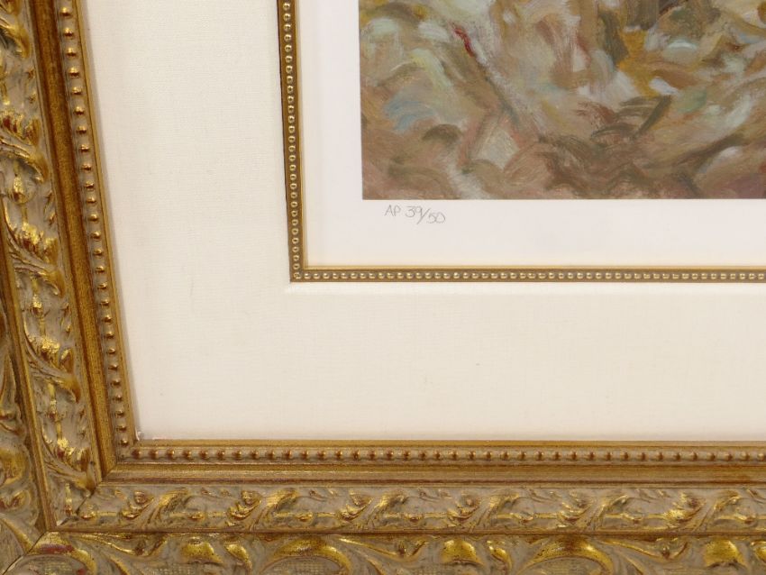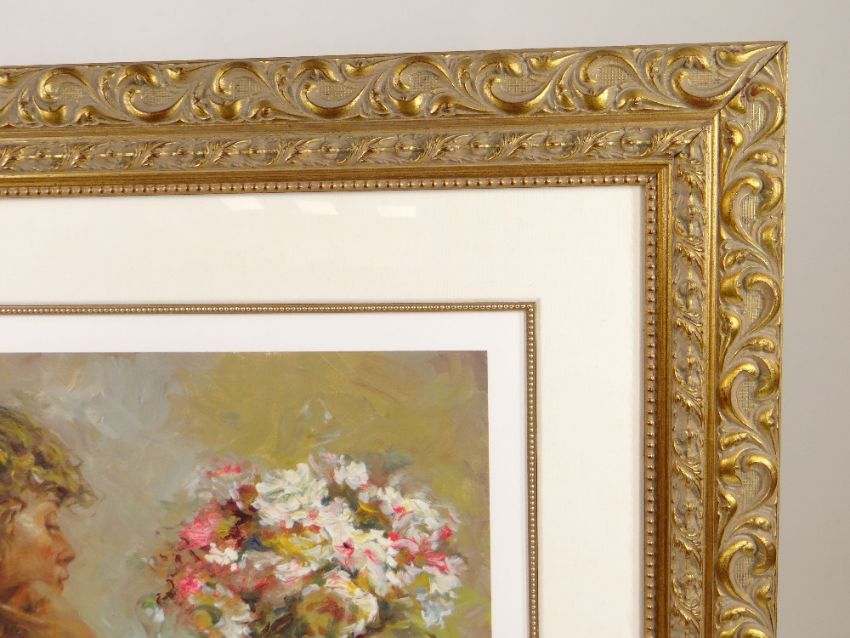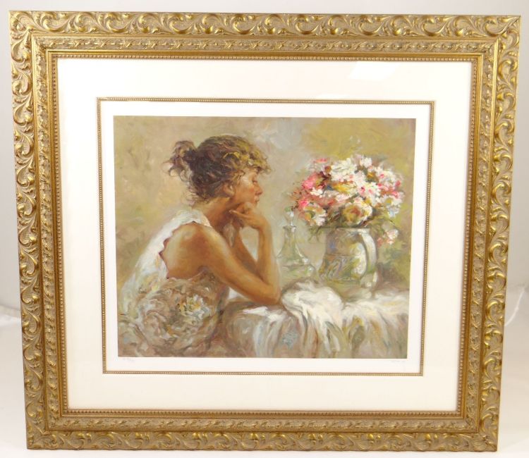 JOSE ROYO limited edition (AP39/50) serigraph - Pensitiva, a girl by a table with flowers, signed and numbered in pencil, (I) 60 x 73.5cms, in gilt frame