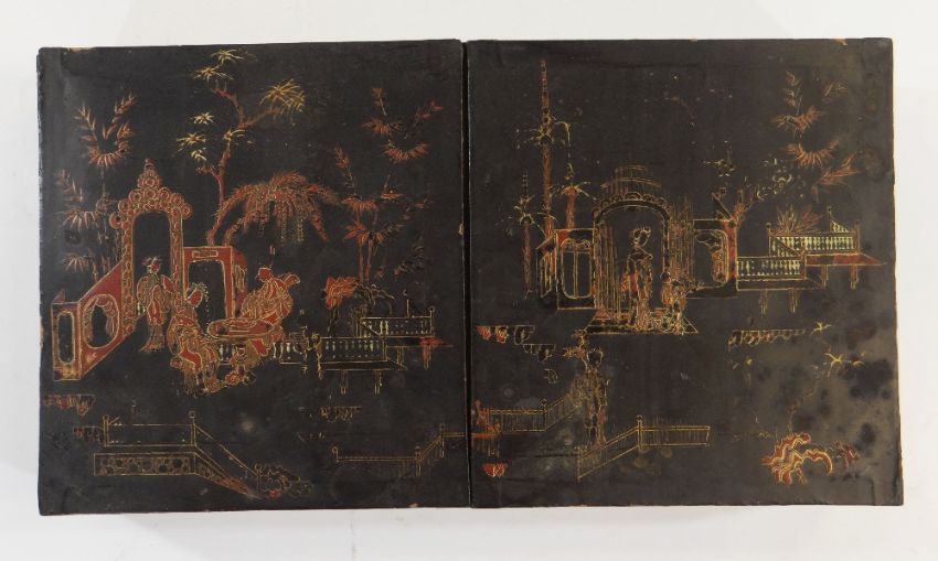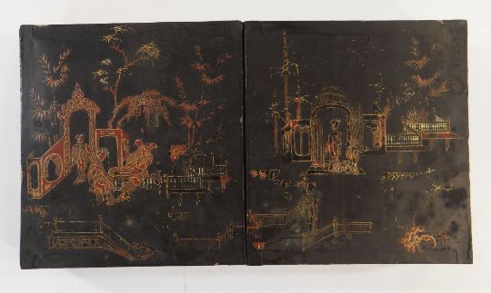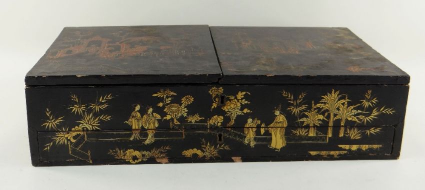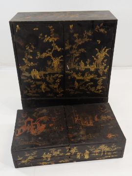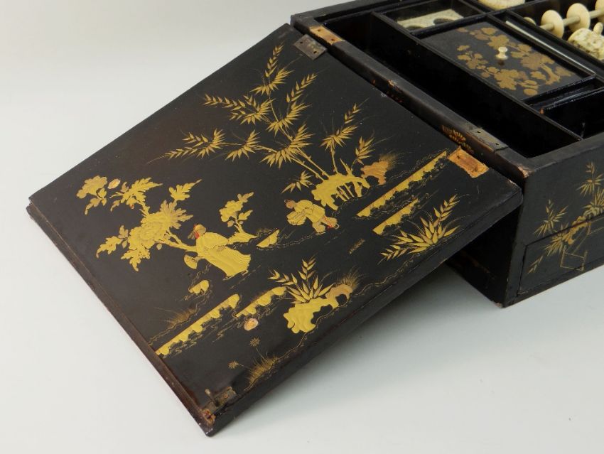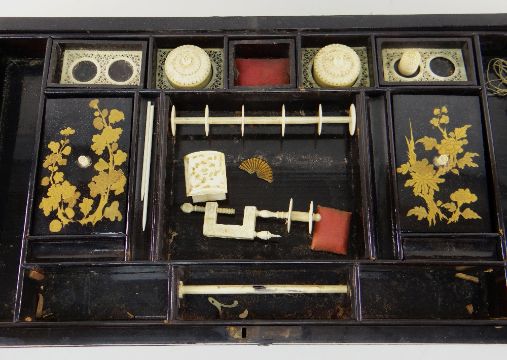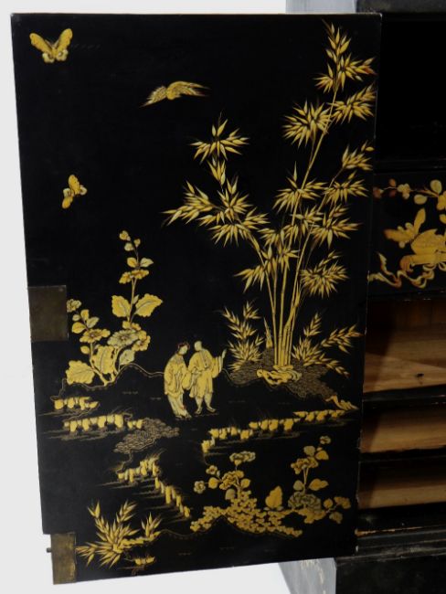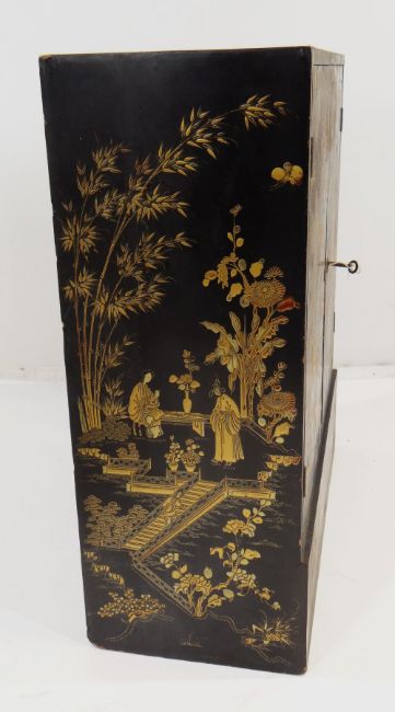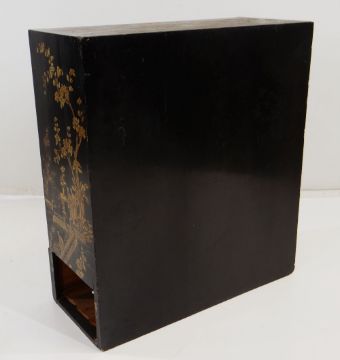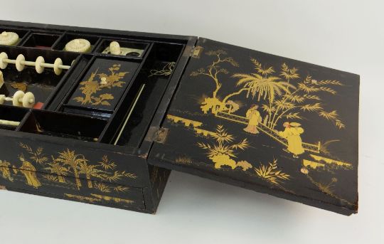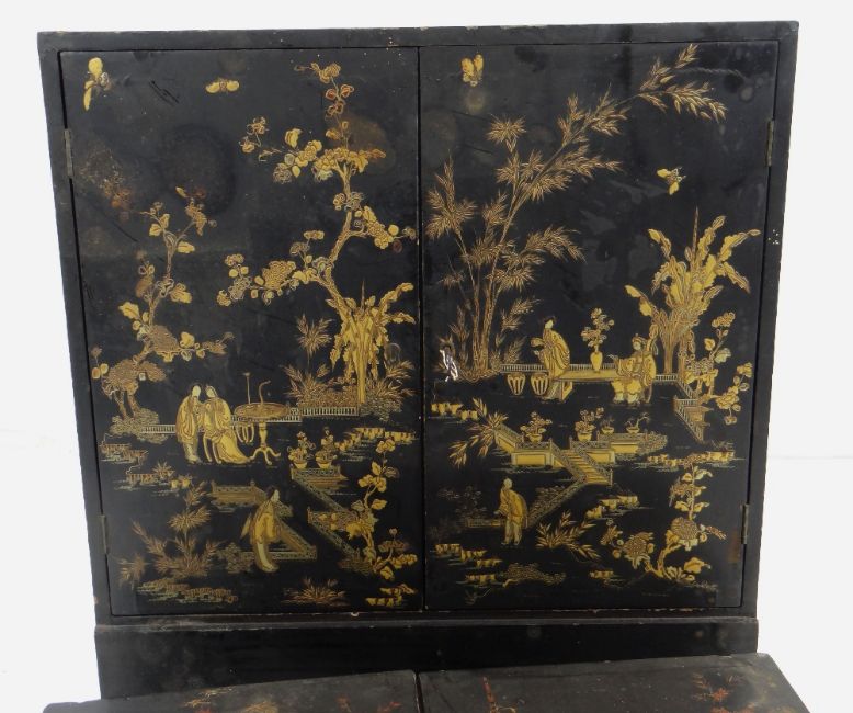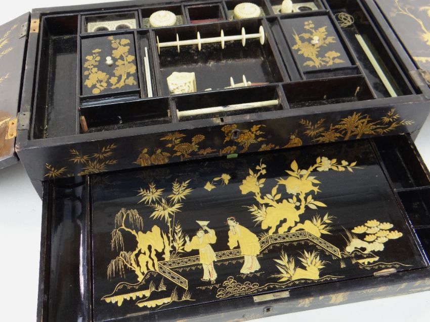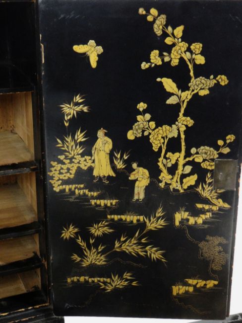 19TH CENTURY CHINESE BLACK & GOLD LACQUER WORK BOX CABINET, c. 1900, the workbox top with flaps opening to reveal an interior with ivory fittings Condition Report: cabinet with some drawers missing, lacks stand.Cabinet dimensions:Height – 59cm’sLength – 53cm’sDepth – 22cm’s