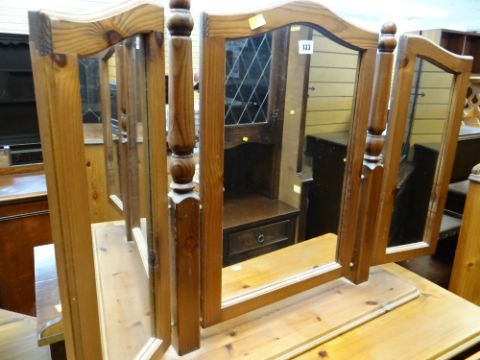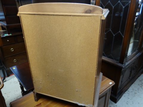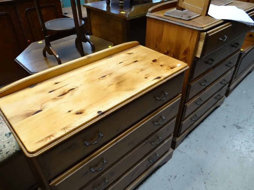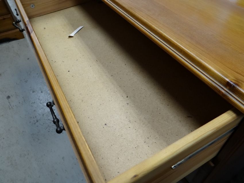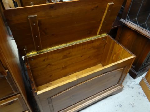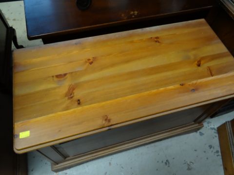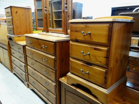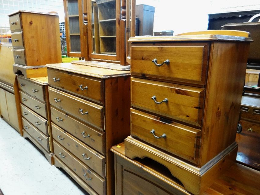 ASSORTED MODERN PINE BEDROOM FURNITURE including four chests, a blanket trunk and dressing table mirror (6)The two bedside tables:Height – 62cm’sWidth – 44cm’sDepth – 38cm’s The smaller set of drawers:Height- 82cm’sWidth – 83cm’sDepth – 38cm’s The larger set of drawers:Height – 95cm’sWidth – 83cm’sDepth – 38cm’s The blanket chest:Height – 52cm’sWidth – 80cm’sDepth – 38cm’s The mirror:Height – 64cm’sWidth – 99cm’sDepth of base – 16cm’s The drawer sides are wood, the backs and bases are board.Light surface scratches to most.The two bed side table have a few dents/dings.The smaller chest of drawers looks faded.General wear to most.No major structural damage.Mirror looks good just dusty.All drawers slide well.