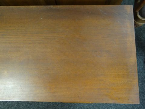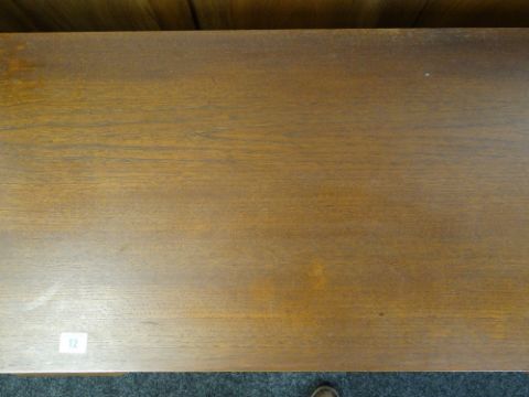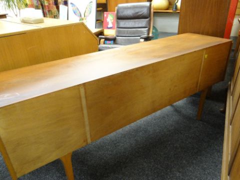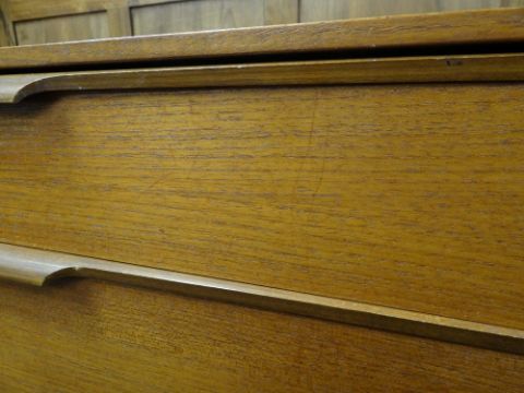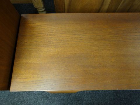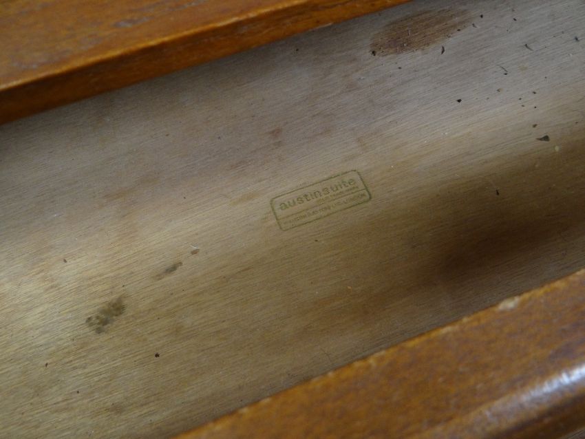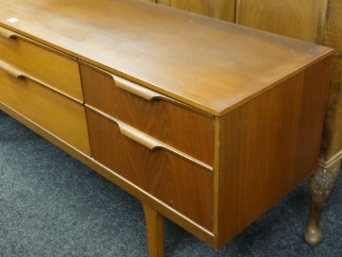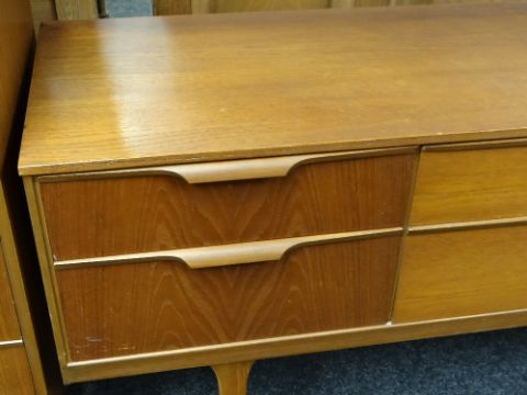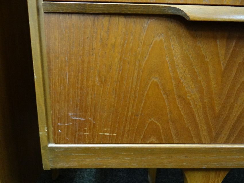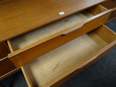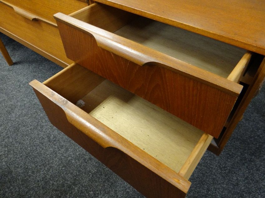 MID-CENTURY TEAK AUSTINSUITE SIDEBOARD, fitted six drawers, gilt stamp inside, 159 x 43 x 69cms (no mirror back)Missing mirror. Water marks and stains. Scratches especially bottom left corner and top surface right corner. Drawers all open and slide well.