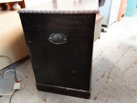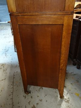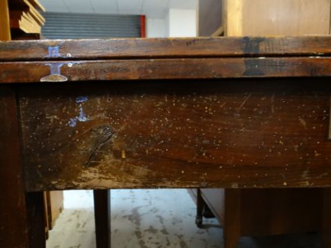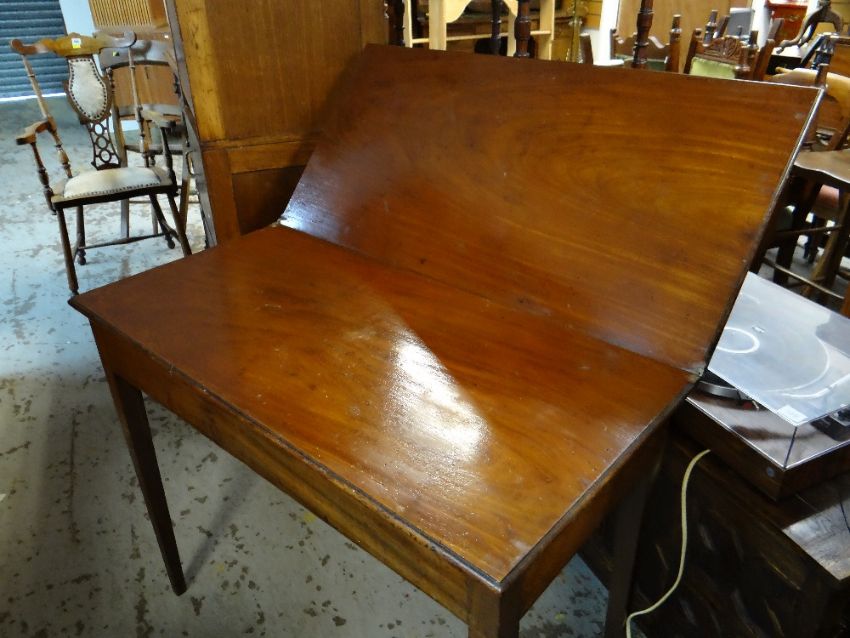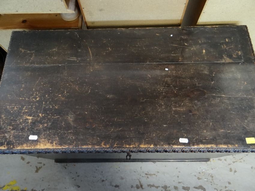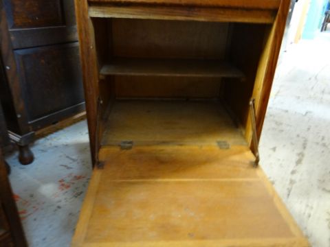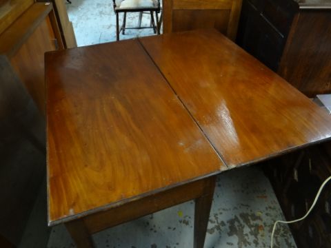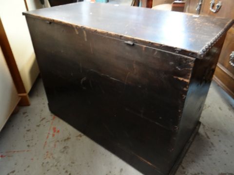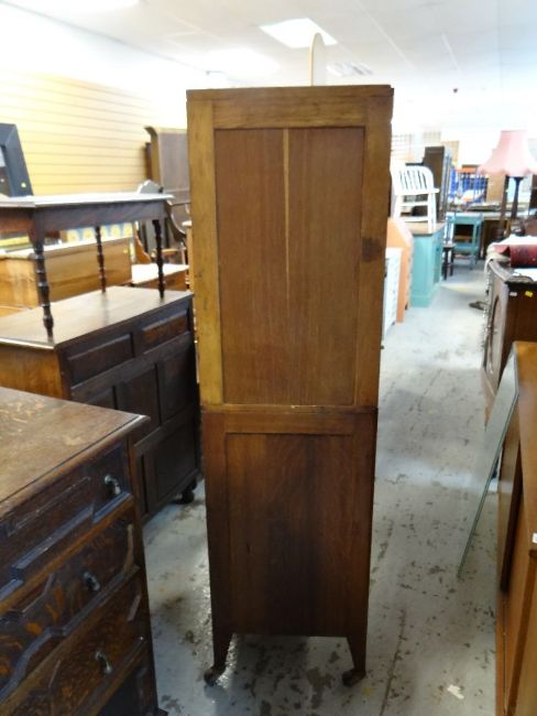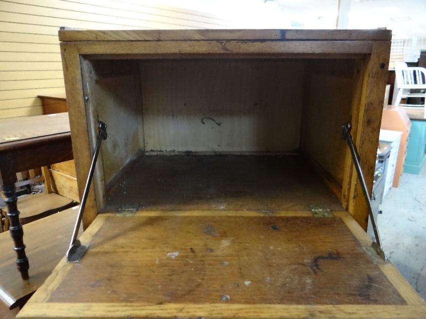 ASSORTED OCCASIONAL FURNITURE including Edwardian stained beech armchair, Georgian mahogany tea table, stained pine blanket box, vintage oak tall double cupboard (4)All pieces have general wear, scratches and worn corners.There is staining on top of the tea table. The legs feel wobbly and there is worm on the back.The blanket box also has lots of wear. Missing handle, missing corner section. No worm.