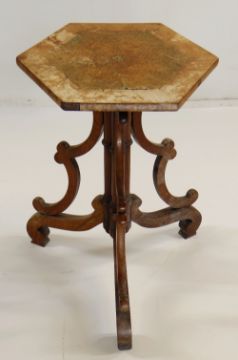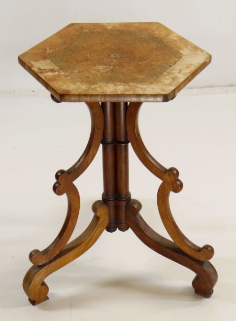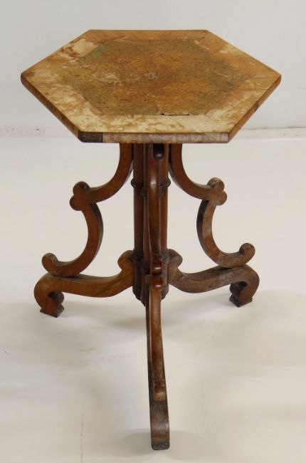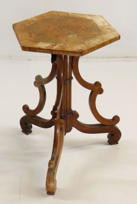 VICTORIAN WALNUT TRIPOD TABLE, hexagonal inlaid top on triple cluster column support with bowed brackets and scrolled feet, 34cms diam