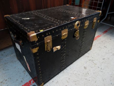 VINTAGE STEAMER TRUNK with brass plated locks and corner clasps, leather handles