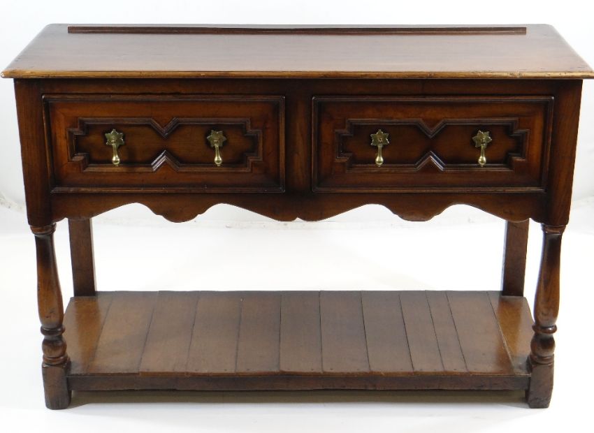 CHARLES II-STYLE OAK DRESSER BASE, moulded top above geometric frieze drawers, turned front supports, boarded base, 130 x 46 x 86cms