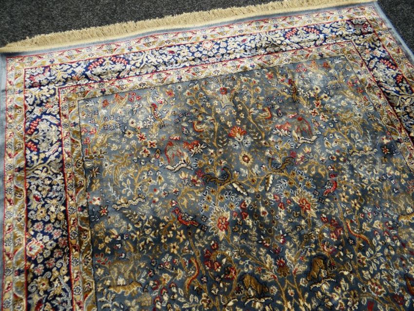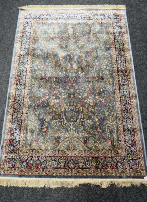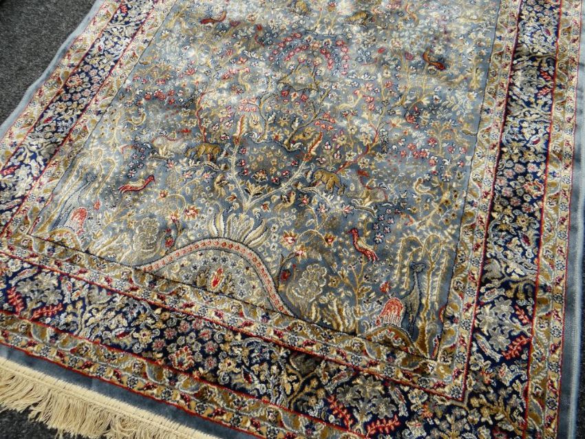 MODERN KASHMIR RUG, artificial silk, the garden design duck egg blue filed with exotic animals and birds amongst flowering trees and shrubs, indigo border and double guards, 170 x 117cms