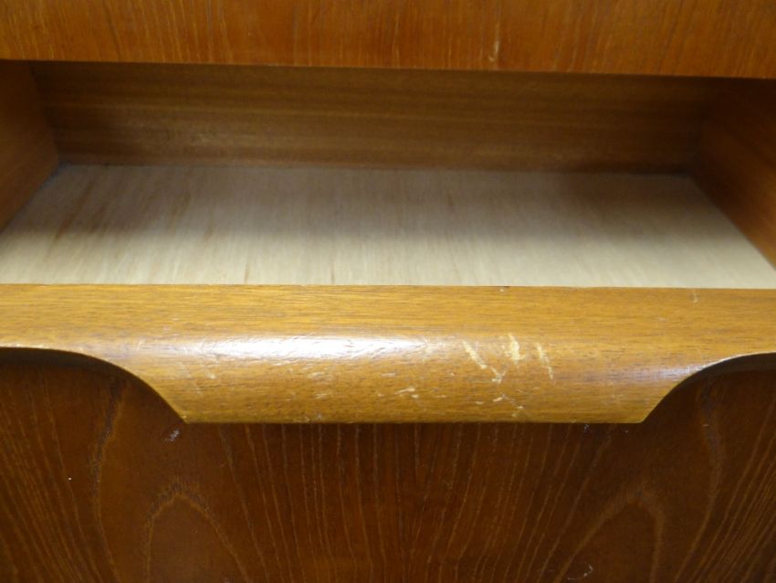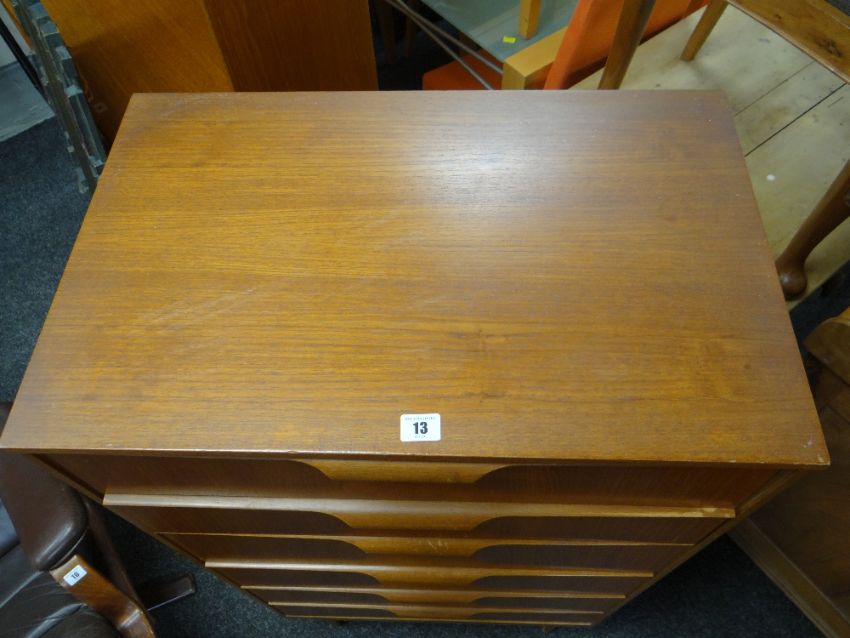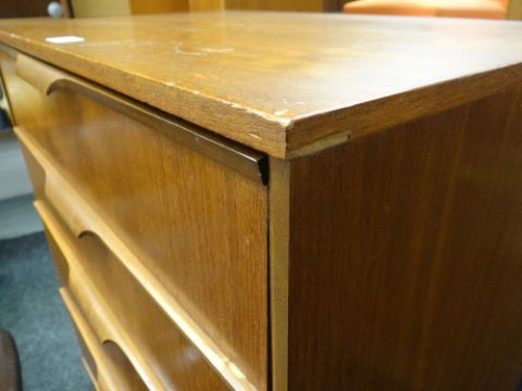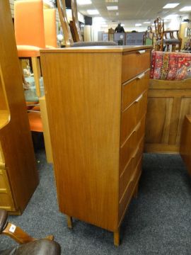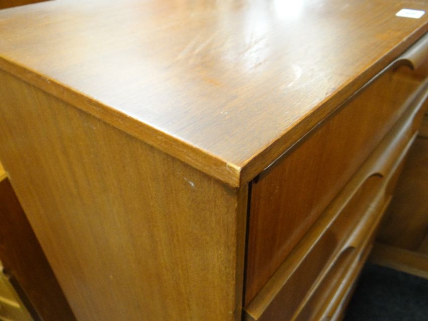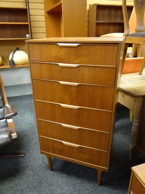 MID-CENTURY AUSTINSUITE TEAK TALL CHEST, fitted six drawers, gilt stamp inside, 64 x 43 x 122cmsScratches and watermarks on top surface. Veneer missing top corner. Scratches on handles. All drawers slide well.