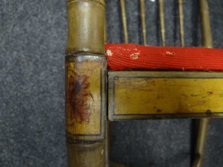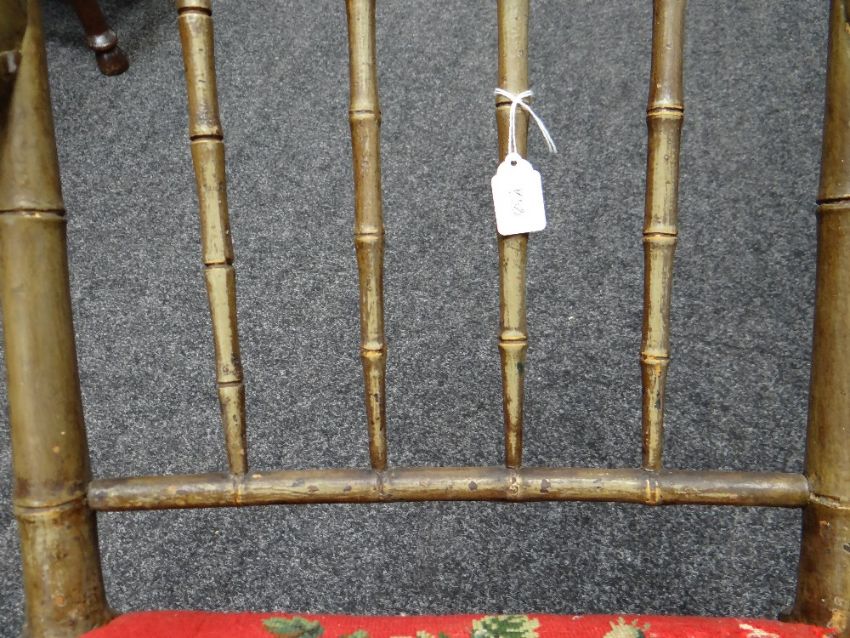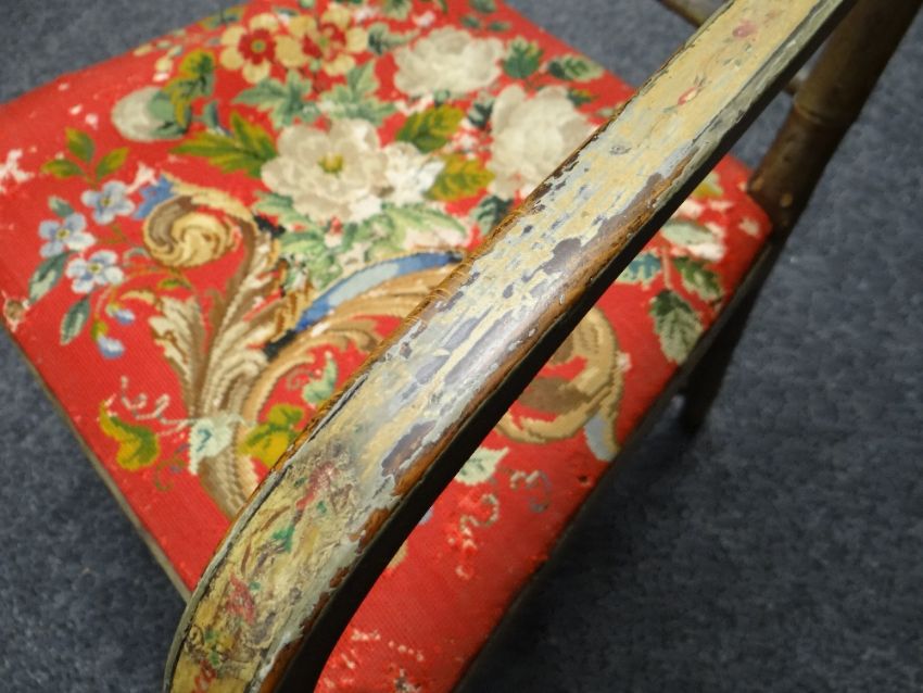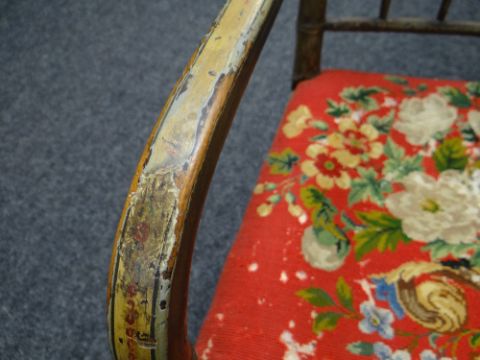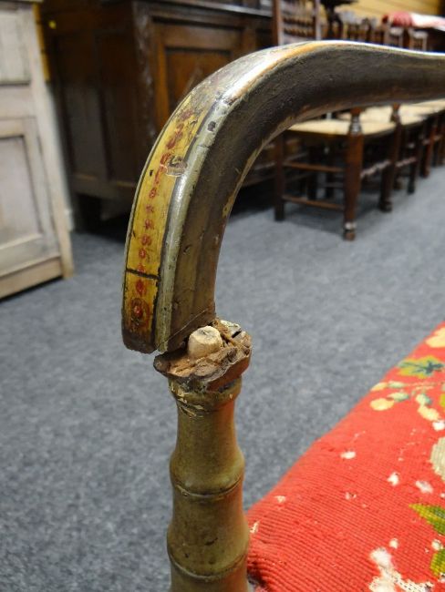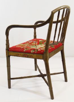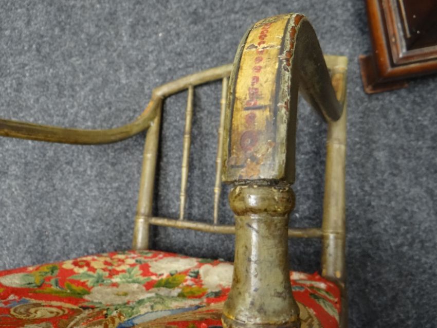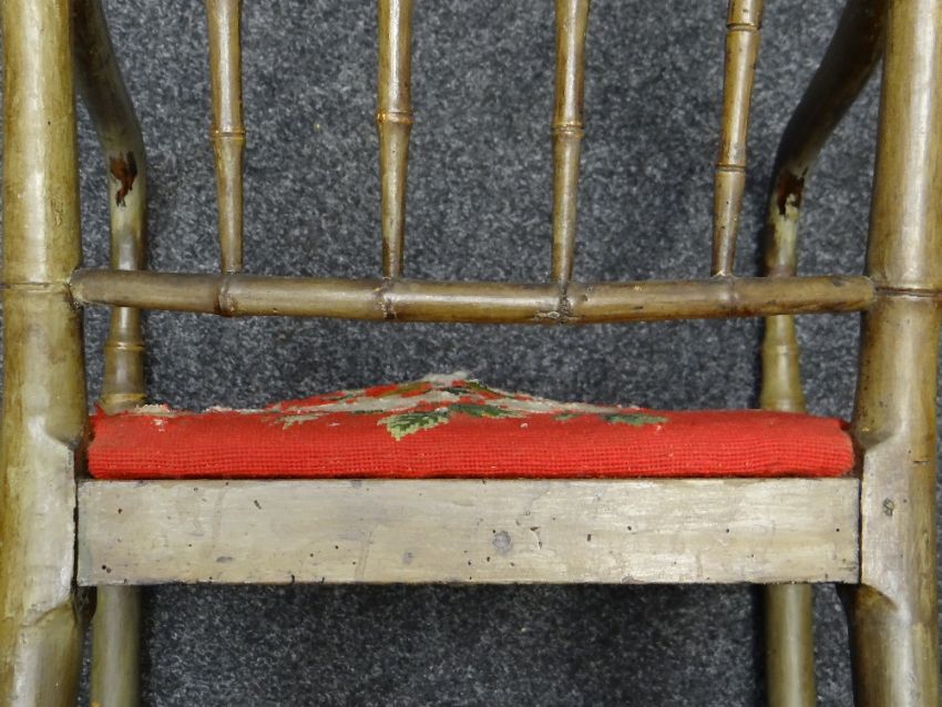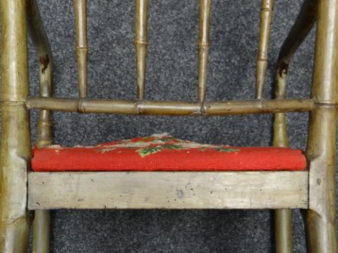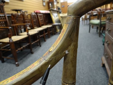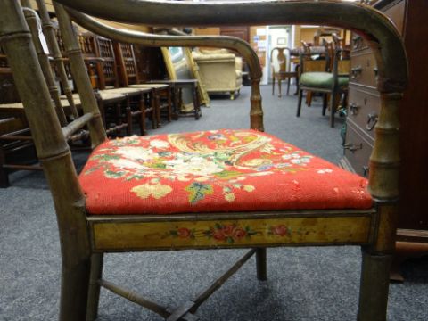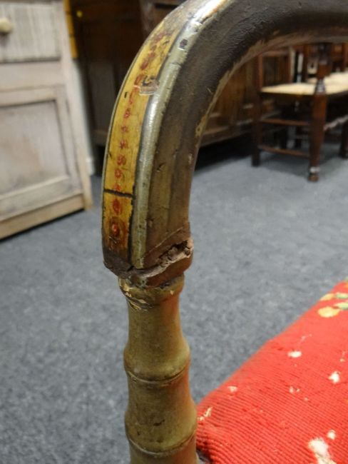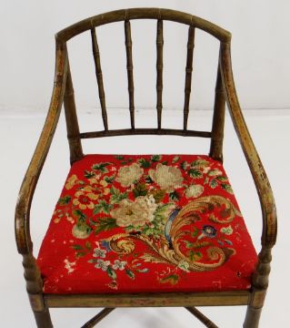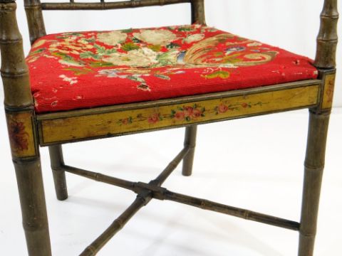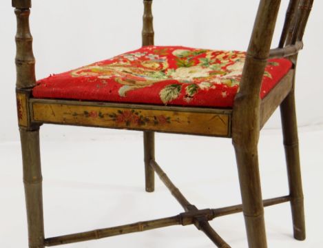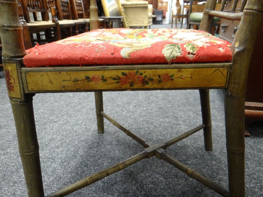 REGENCY PAINTED FAUX-BAMBOO ARMCHAIR, bar splat and downswept arms, needlework tapering seat, on bamboo form legs joined by X-stretcher Condition: Paintwork worn, arm repaired.The chair doe feel a little ‘wobbly’ when checked.There is cushion damage.the painted decoration is worn especially on the arms.One arm is damaged (see photographs)The cross-banding leg support is very loose, which is why it might feel a little wobbly.One arm is cracked and has been restored.There are numerous places of restoration, the back, legs and arms.