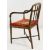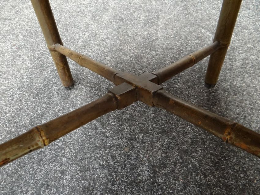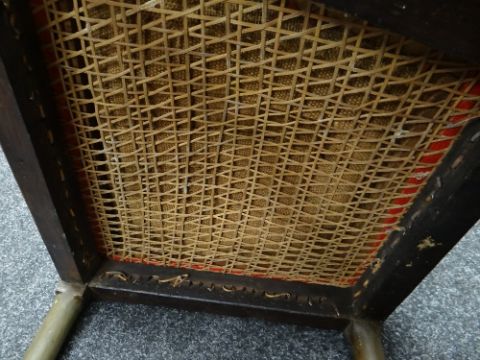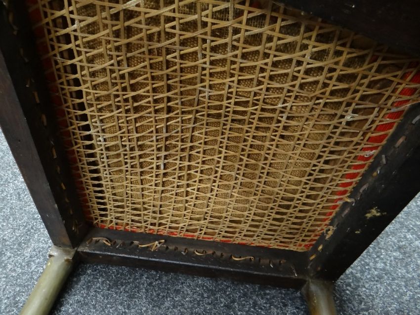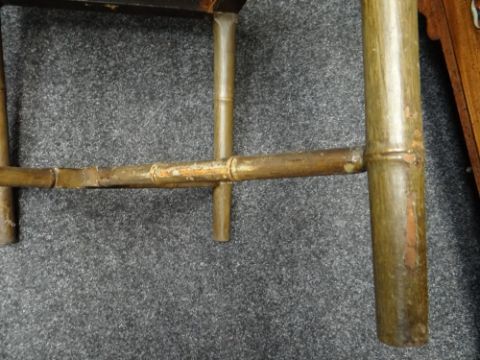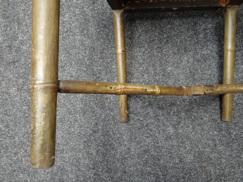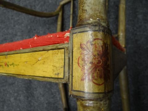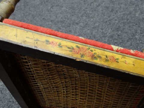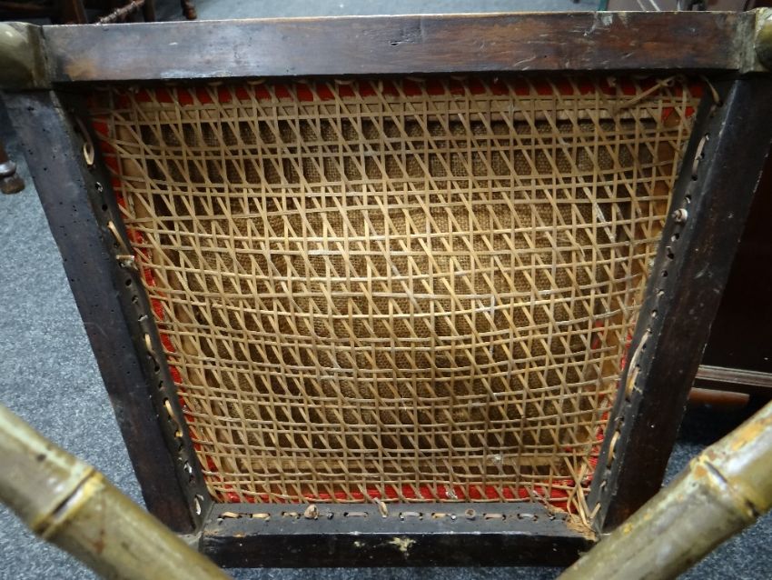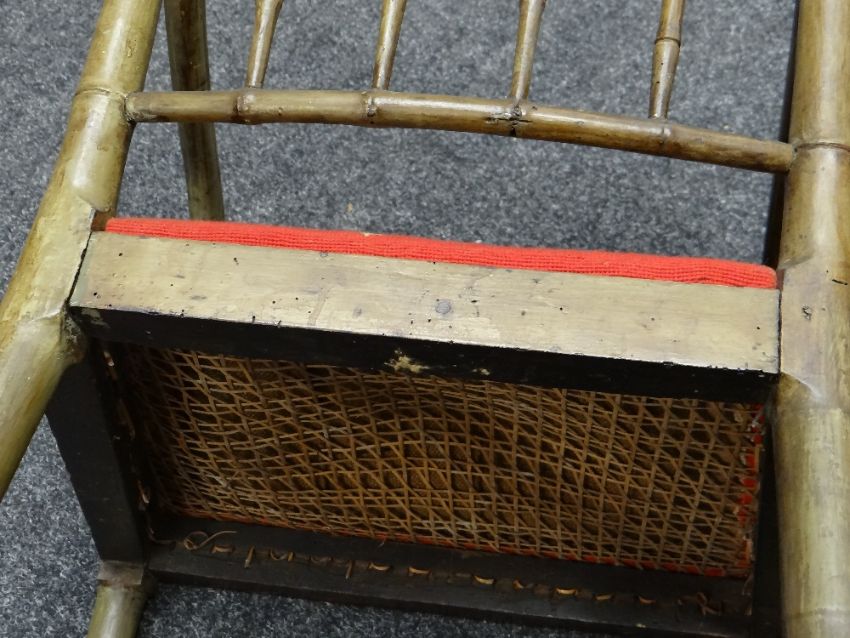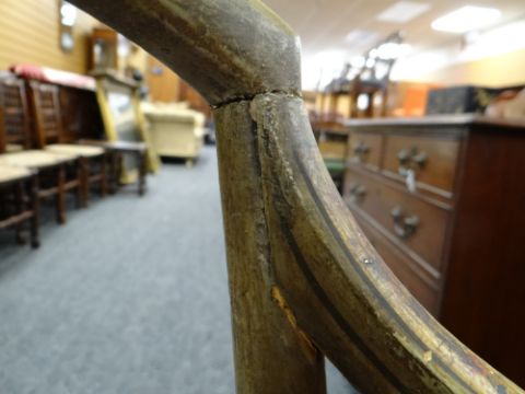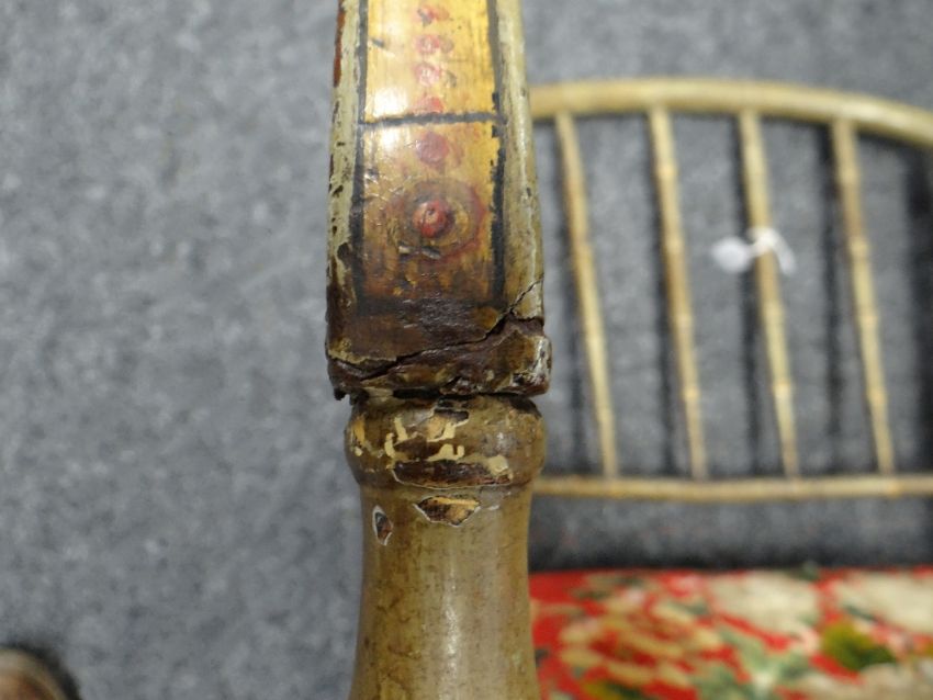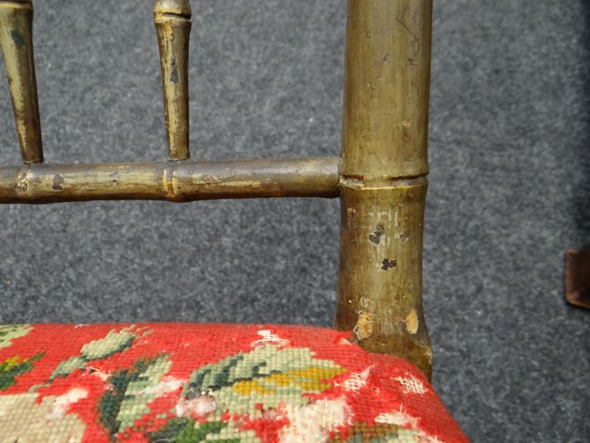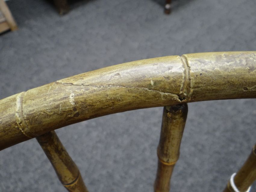 REGENCY PAINTED FAUX-BAMBOO ARMCHAIR, bar splat and downswept arms, needlework tapering seat, on bamboo form legs joined by X-stretcher Condition: Paintwork worn, arm repaired.The chair doe feel a little ‘wobbly’ when checked.There is cushion damage.the painted decoration is worn especially on the arms.One arm is damaged (see photographs)The cross-banding leg support is very loose, which is why it might feel a little wobbly.One arm is cracked and has been restored.There are numerous places of restoration, the back, legs and arms.