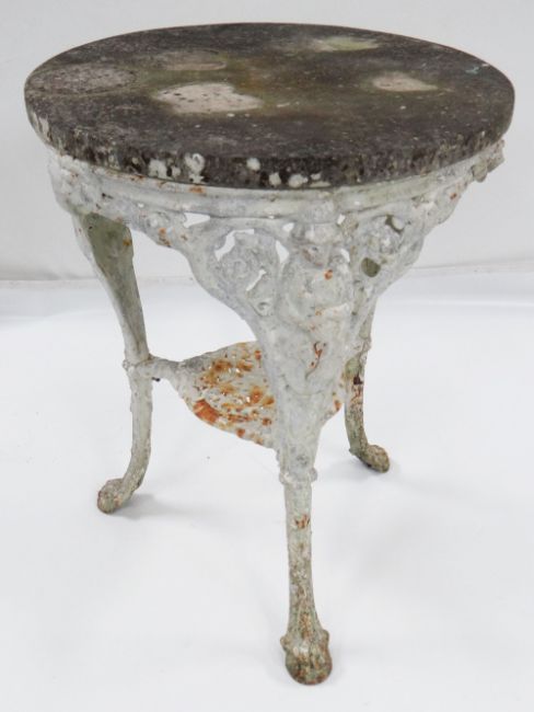 ANTIQUE CAST IRON GARDEN TABLE, with marble top (weathered), 59cms diam.