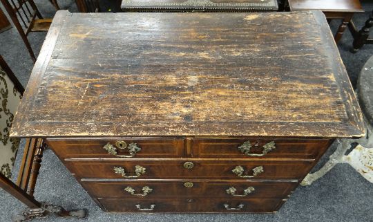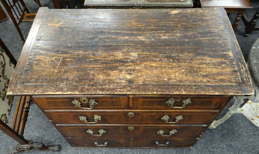 MID-18TH CENTURY WALNUT & FEATHERBANDED FIVE-DRAWER CHEST, fitted with oval escutcheons, and gilded acanthus cast handles (formerly the top of a chest on chest), 101 x 56 x 90cms