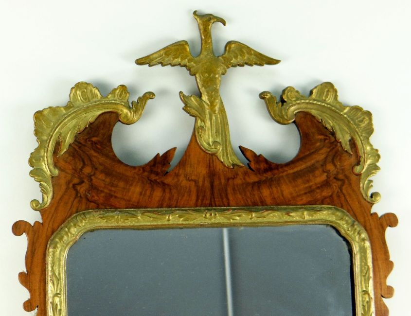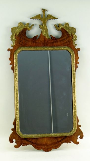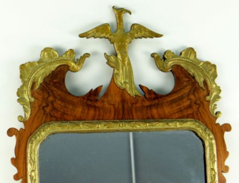 GEORGE III-STYLE PARCEL GILT MAHOGANY FRET MIRROR, with Ho-Ho bird and rocaille surmount, and cut scroll cornersThe gold boarder that runs around the glass has a few cracks in it and looks overpainted, the paint looks very thick in places.There is a scratch on the glass, no other damage.The wood is also starting to crack in places.