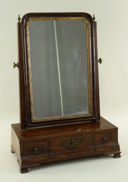 GEORGE III-STYLE MAHOGANY BOX BASE DRESSING TABLE MIRROR, reeded swing frame with gilded slip, three base drawers, bracket feet