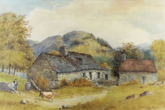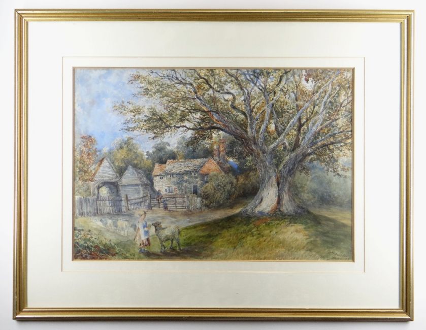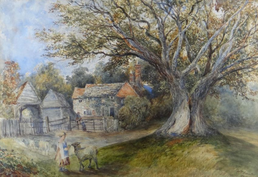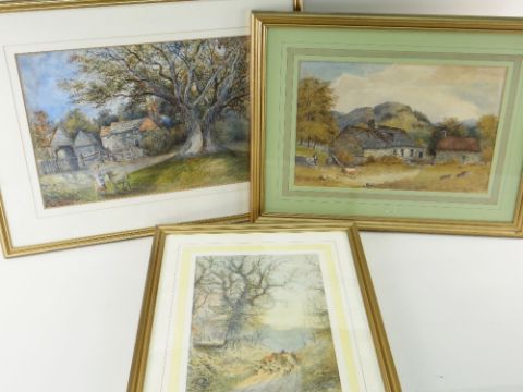 THREE 19TH CENTURY WATERCOLOURS including WILLIAM THORNTON (19th Century) girl feeding a lamb near a tree and cottage, signed and inscribed 'Sketching Day 72', 33 x 48cms, CHARLES L. SAUNDERS (1855-1915) stonehouse with figures and cattle, signed, 28 x 43cms and HENRY CLARK PIDGEON (1807-1880) Nearly Home, a drover with sheep and cattle on a lane, signed, 37 x 26cms (3)