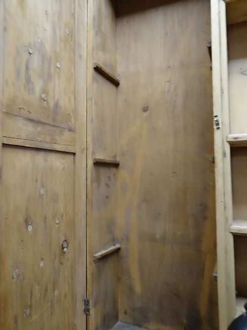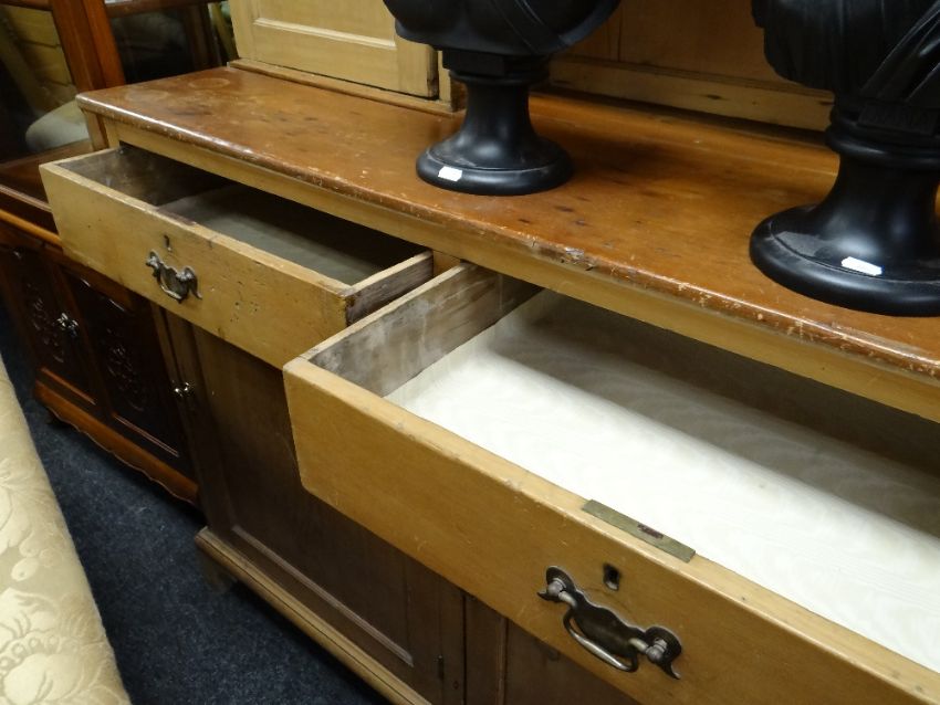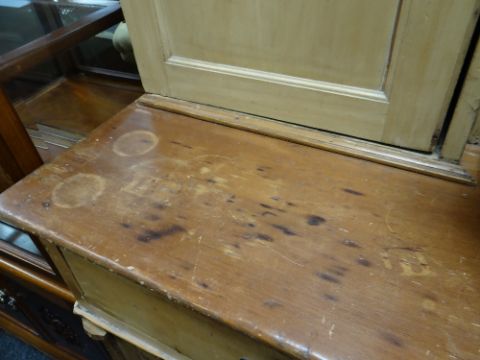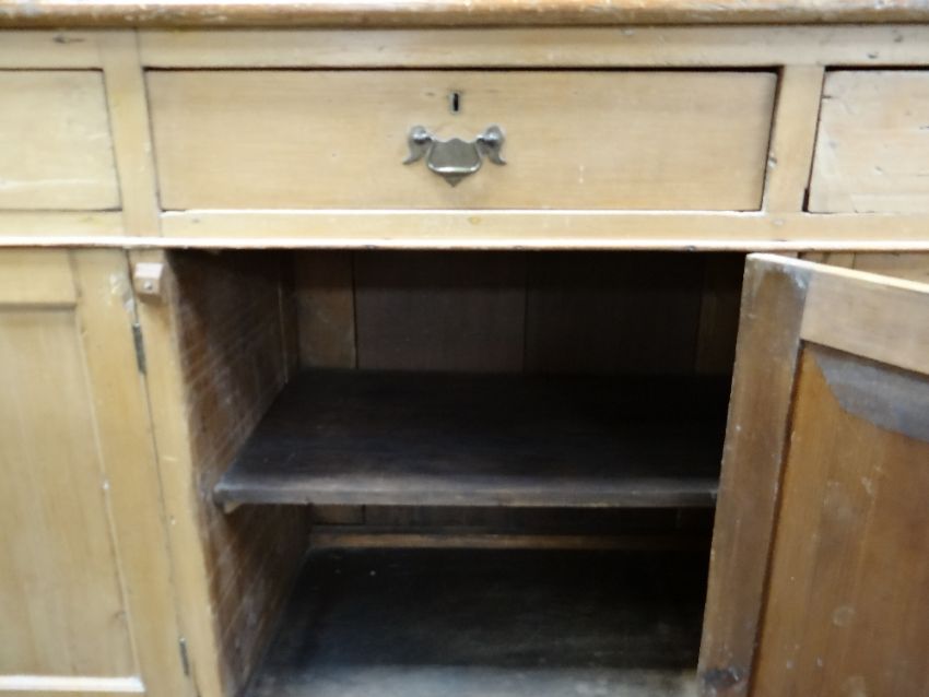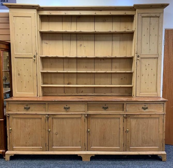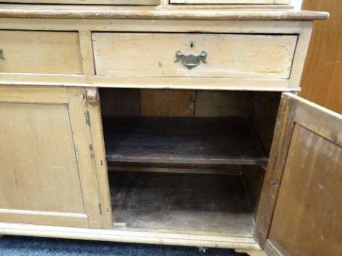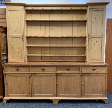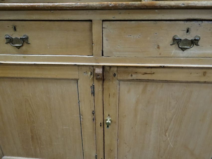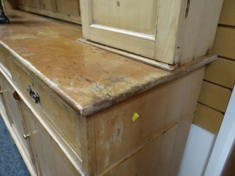 LARGE ANTIQUE PINE COUNTRY HOUSE KITCHEN DRESSER, boarded plate rack with flanking cupboards, a base fitted with drawers and cupboards, bracket feet, 260 x 50 x 250cmsIt is not clear if the base is together with the top section, it could be a later edition. They have certainly been together for a long time.The back boards have shrunk.The side doors have been plugged.The clasps have been replaced.The is general wear all over, staining and scratches.