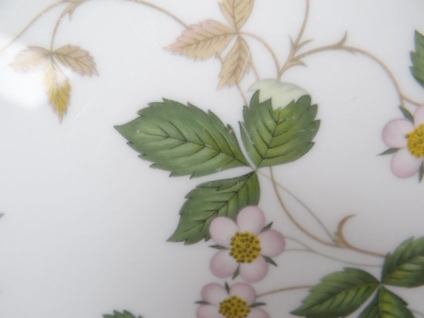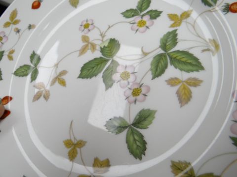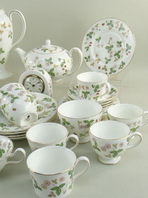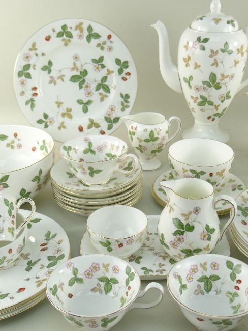 COLLECTION OF WEDGWOOD BONE CHINA 'WILD STRAWBERRY' PATTERN BREAKFAST WARES including teapot, coffee pot, milk jugs, sugar basins, various tea and coffee cups, side plates, dinner plates, cereal bowls ETC (49)No damage or restoration. A few of the tea plates are seconds.Most plates have scratches in the middle like they have been used.