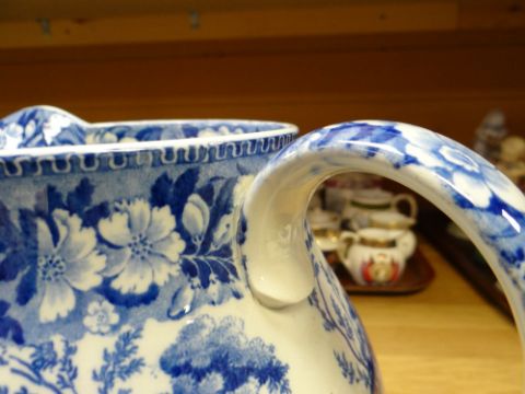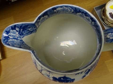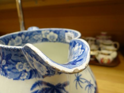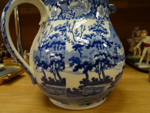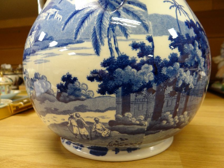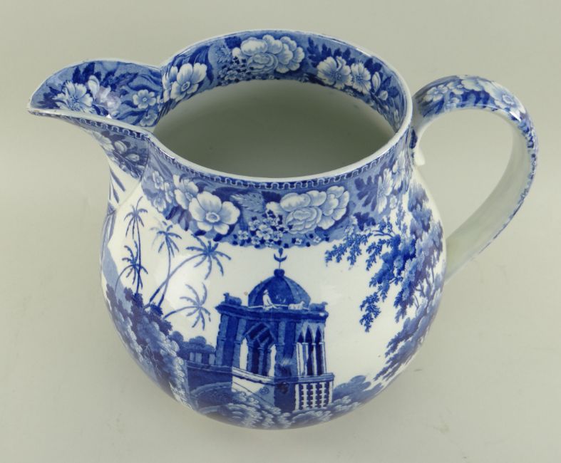 LARGE HERCULANEUM BLUE & WHITE PRINTED POTTERY JUG, decorated with 'View in the Fort, Madura' pattern, floral borders, 23cm highCondition: excellent condition.There are some small chips to the spout.