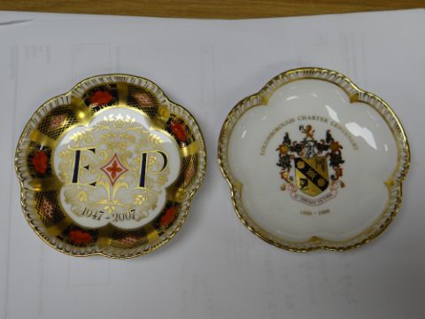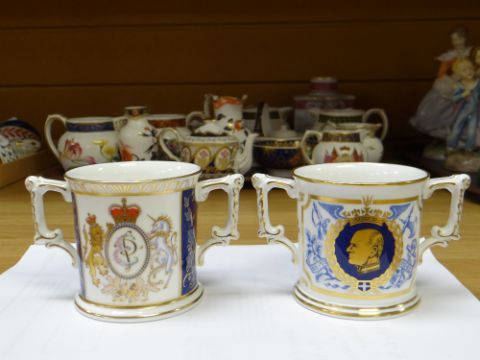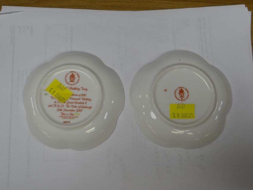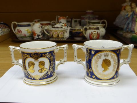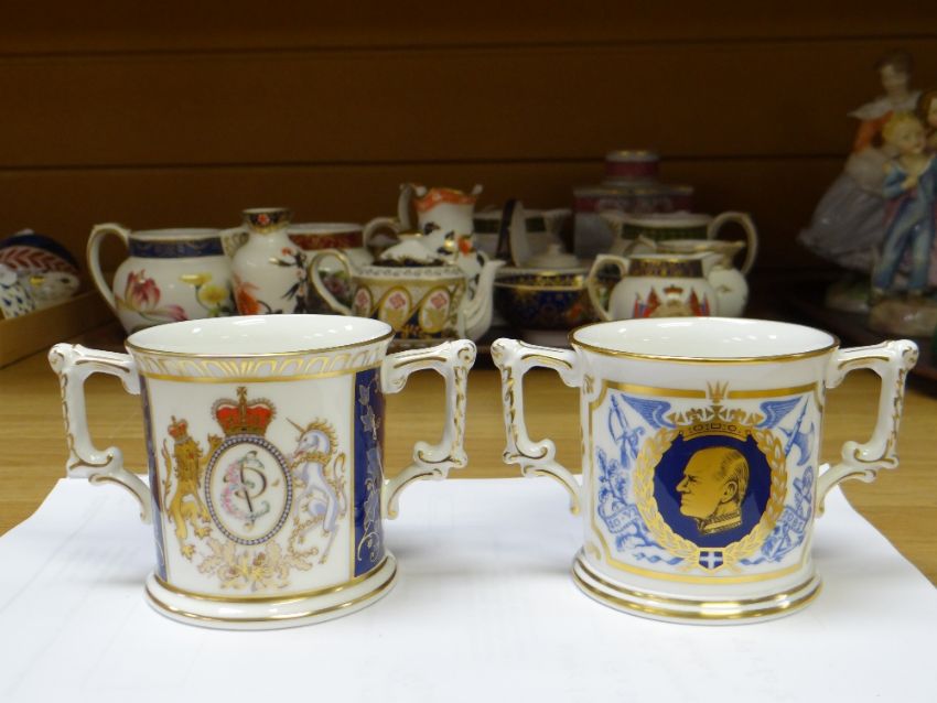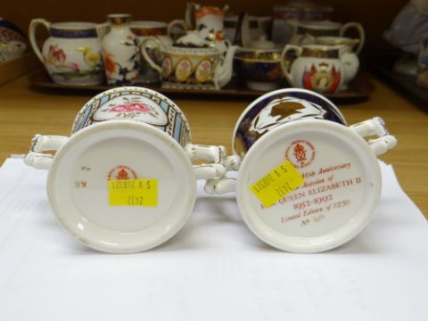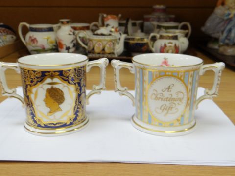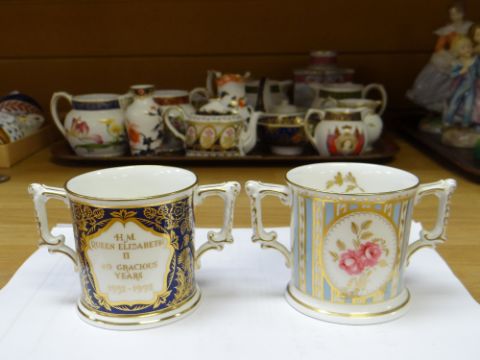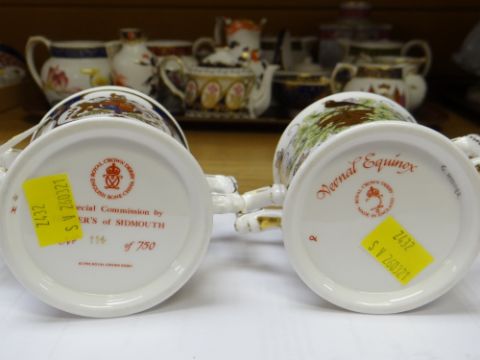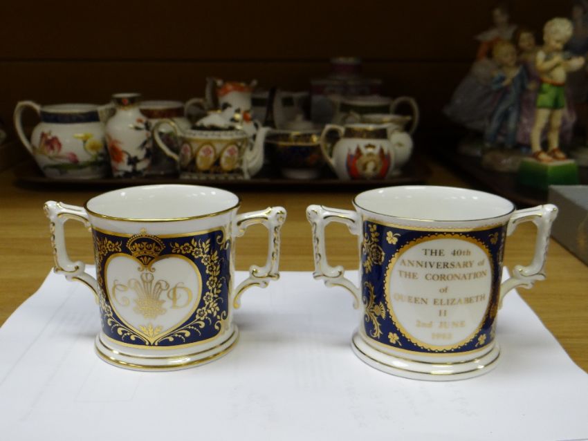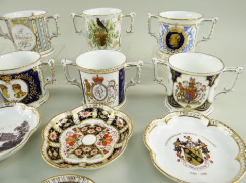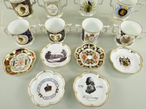 EIGHT ROYAL CROWN DERBY COMMEMORATIVE LOVING CUPS and SIX JAPAN SAUCERS, including 6 for Royal events, 'Vernal Equinox' and 'Christening Gift' (14)