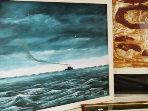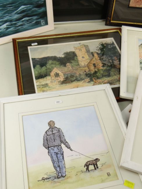 PHILIP E. HARRIS assorted pictures including four watercolours of figure studies, etching in colours, red crayon drawing, acrylic seascape ETC (8)