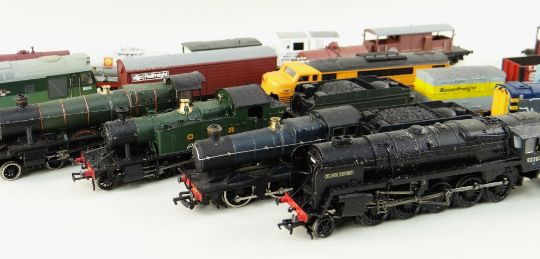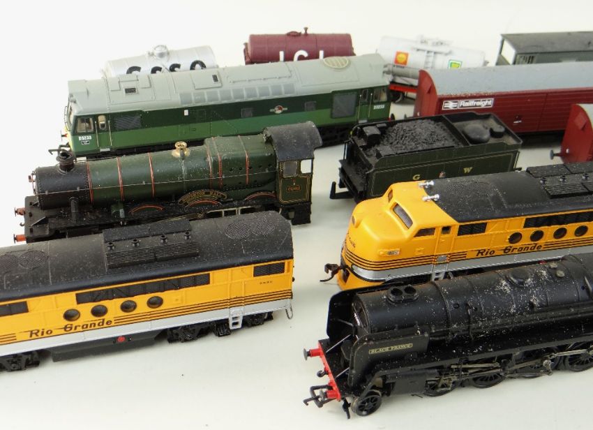 COLLECTION OF BACHMANN & MAINLINE 'OO' GAUGE ELECTRIC LOCOMOTIVES AND ROLLING STOCK, including GW Soughton Hall 6962 loco and tender, BR Black Prince 92203 loco and tender, GWR Prairie Tank 5531 loco, GWR 3205 loco and tender, Rio Grande DCC deisel , 5 petrol tankers, break van, 7 open wagons, ETC.