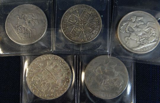 WORLD COINS comprising 1819, 1821 and 1890 crowns, 1889 double florin and 1732 eight reales coin (5)
