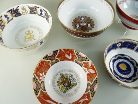 FOUR ROYAL WORCESTER CHINA COMMEMORATIVE BOWLS & A SPODE POTTERY BOWL, including the Millennium, Elizabeth II silver and golden jubilee, 1947-2007 royal diamond wedding ETC. (5)