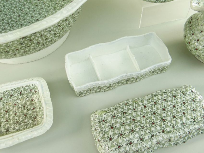 FIVE-PIECE GLAMORGAN POTTERY TOILET WARES SET comprising water jug, 25cms high, basin, 34cms diam, small jug, toothbrush jar and cover, soap dish, each in a rarely seen transfer of tessellated floral design in greens and red, feather moulded borders
