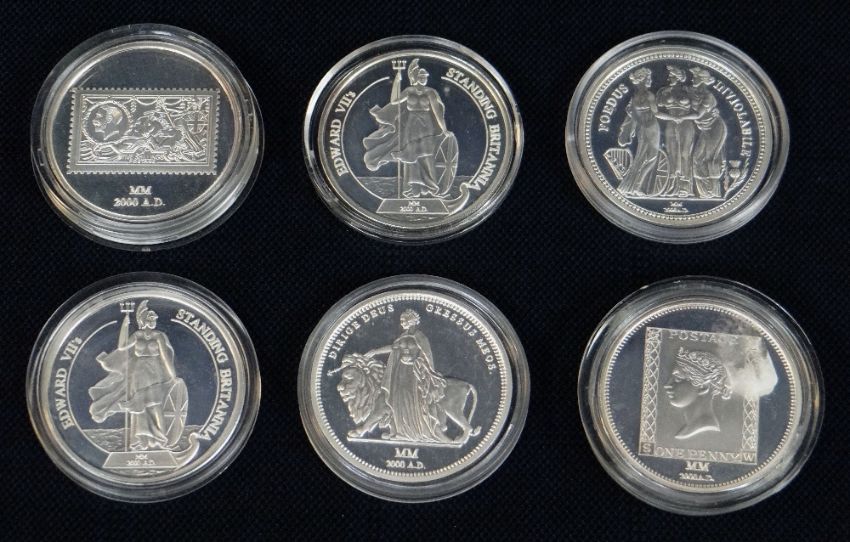 COLLECTION OF SIX SILVER 'MILESTONES OF THE MILLENNIUM' COINS comprising 2 x Edward VII's Standing Britannia, The Penny Black, The Three Graces, George V's Seahorses & Britannia and Victoria's Una and the Lion (6)