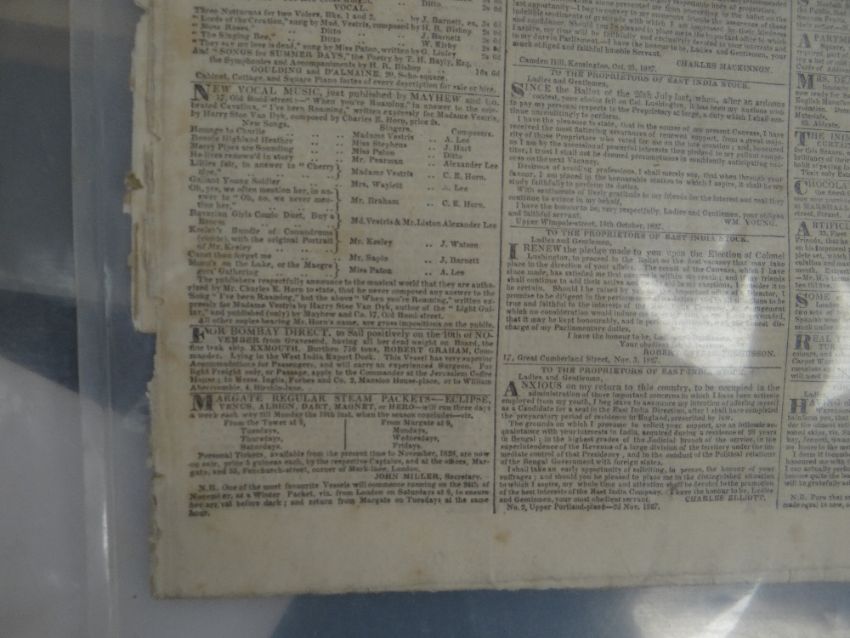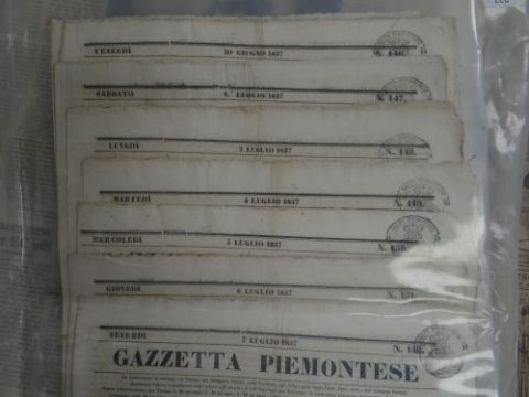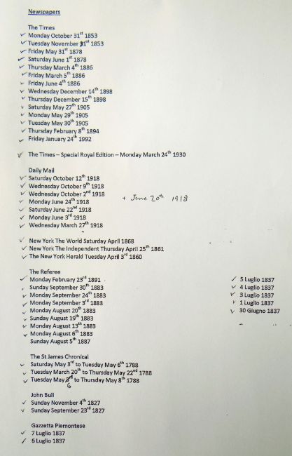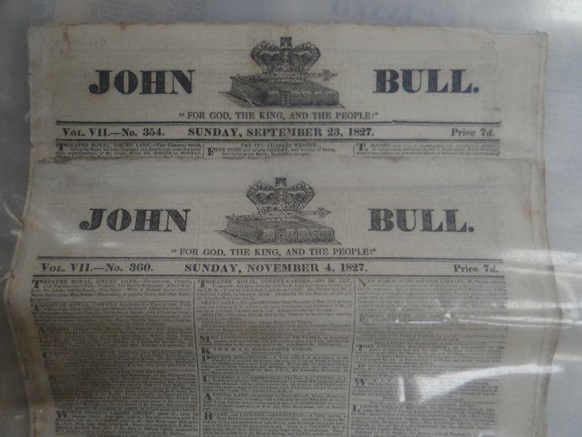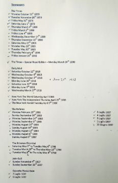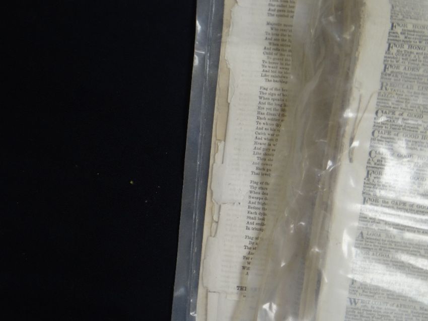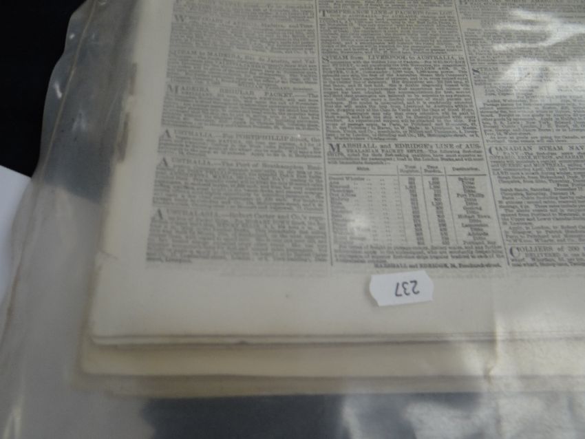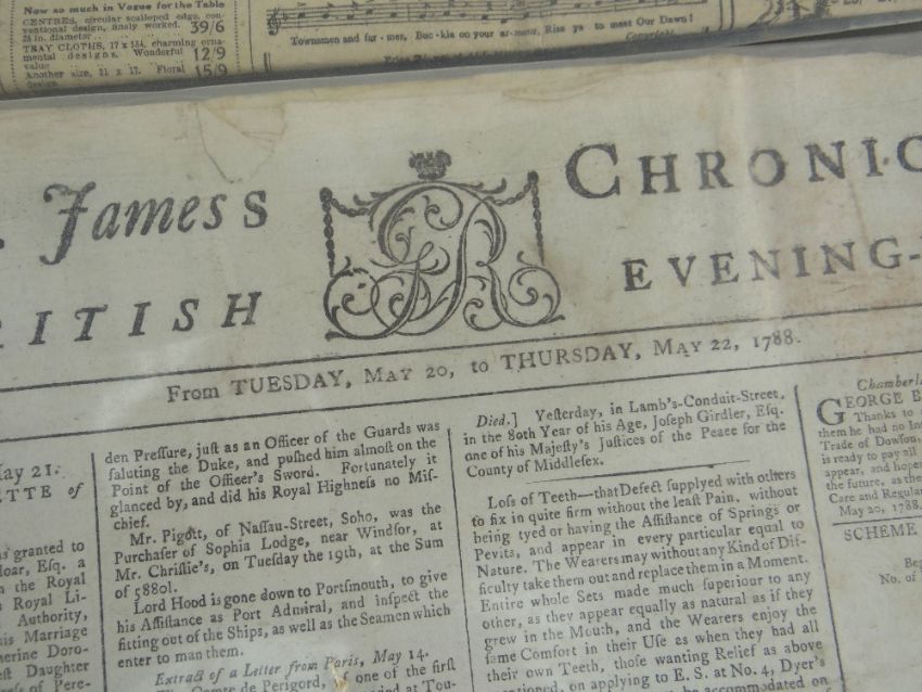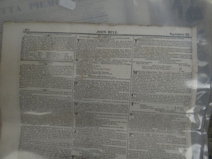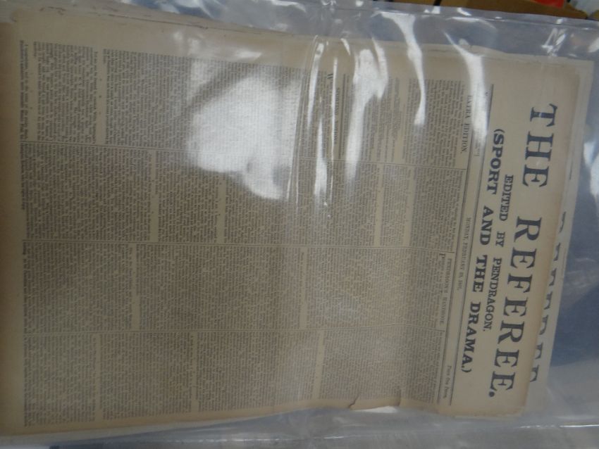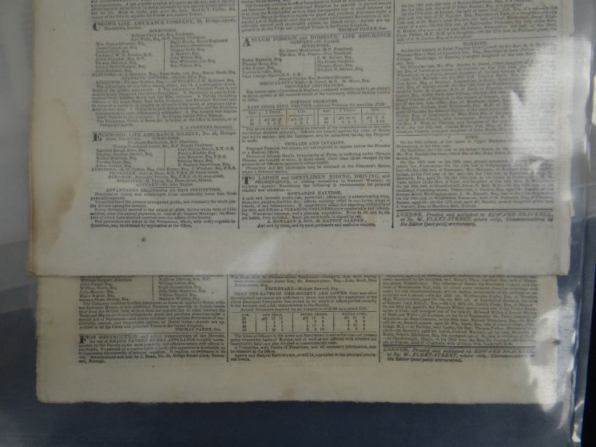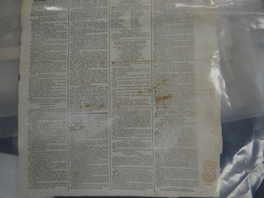 COLLECTION OF OLD NEWSPAPERS, various titles dated from 1788-1918 predominantly (list provided on application)There is general wear, most have yellowing, edge wear and a few have water stains, I could see through the plastic covers.I could not see any cut outs.I did not open all as they are very delicate.